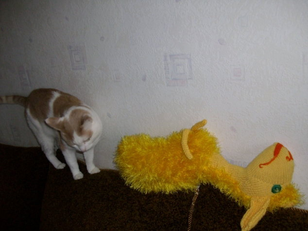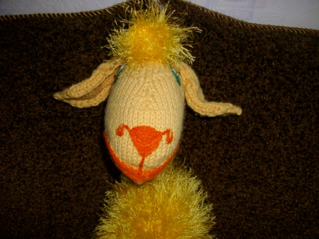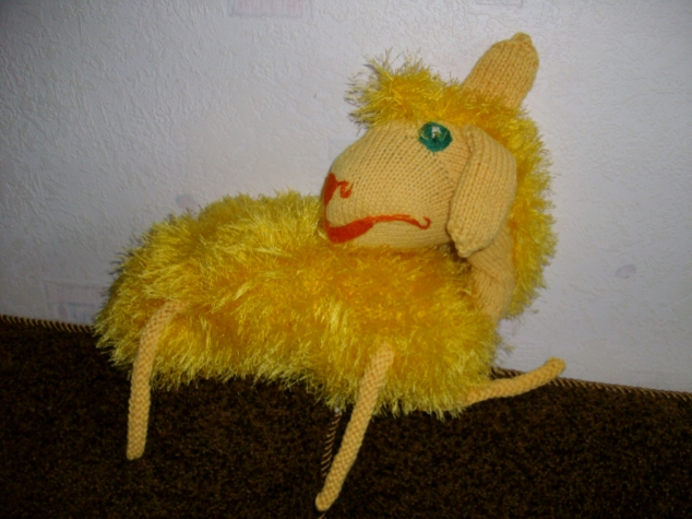 Овца цельновязанная, ушки и лапки связаны отдельно и пришиты, мордочка вышита. Набивка - синтепон. При вязании Золотого Руна в самый последний момент закончился синтепон, и половину головы пришлось набить пряжей от распущенного изделия. Зато она теперь не только гламурная модница, не только с характером, но и самая умная - в голове сплошные извилины.))) Думаю, её можно будет безбоязненно стирать в машине - мордочка и лапки из полушерсти, туловище из травки Декофур, укреплённой хлопчатобумажным ирисом.