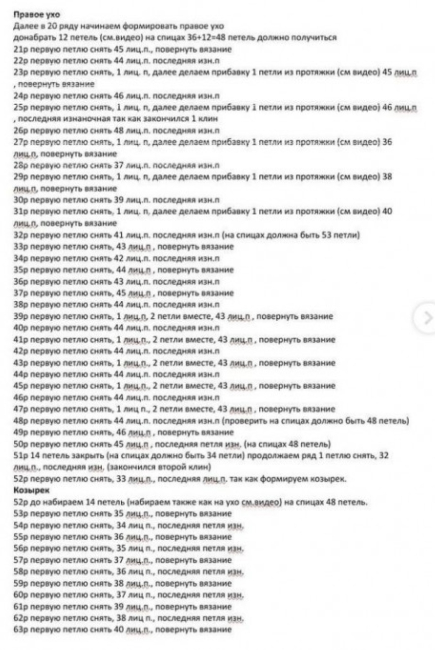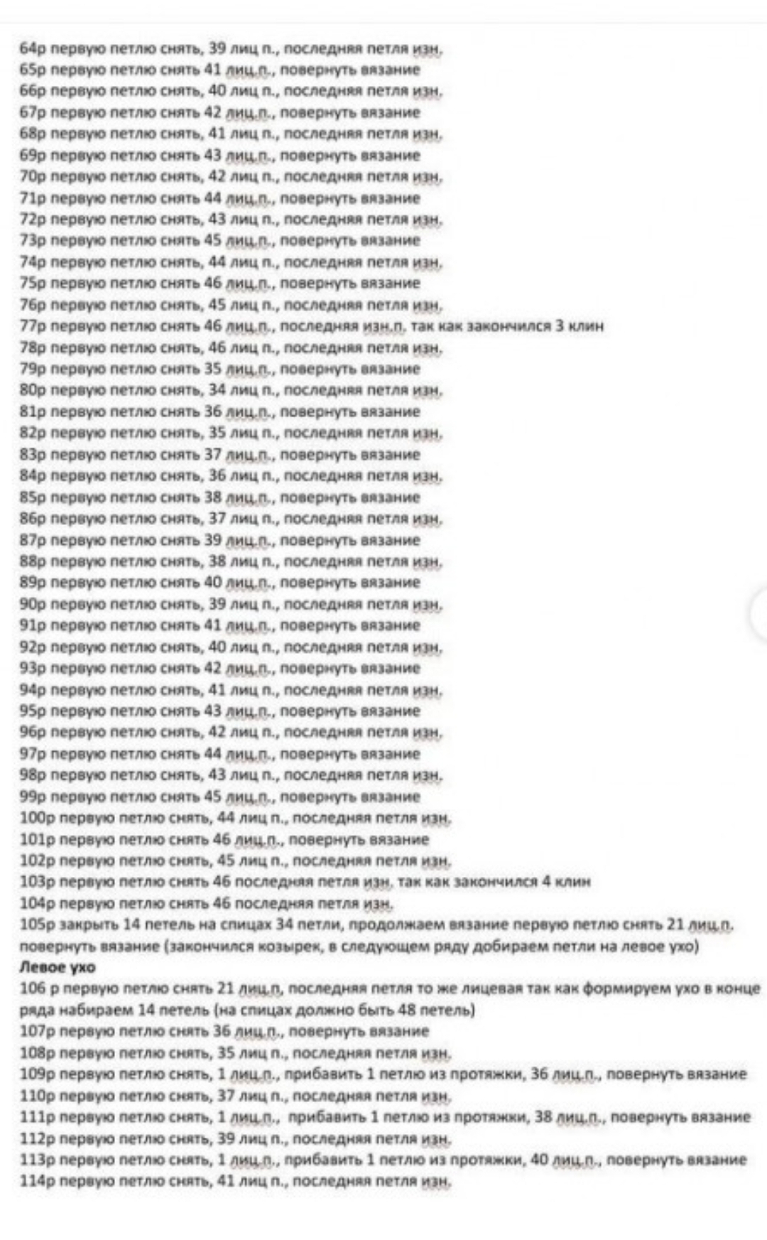20р первую петлю снять 32 лиц.п. (последнюю вяжем лицевой так как начинаем формировать правое ухо)