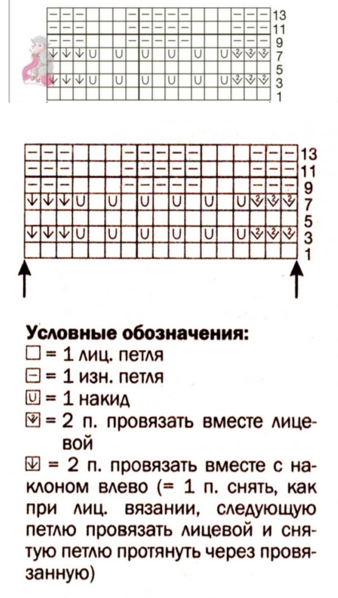 Ажурный узор: количество петель кратно 17. Вязать по приведенной схеме. На ней даны лиц. р. В изн. р. петли и накиды провязывать изнаночными. В ширину повторять раппорт между стрелками. В высоту выполнить 1 раз с 1-го по 14-й р., затем повторять с 3-го по 14-й р.