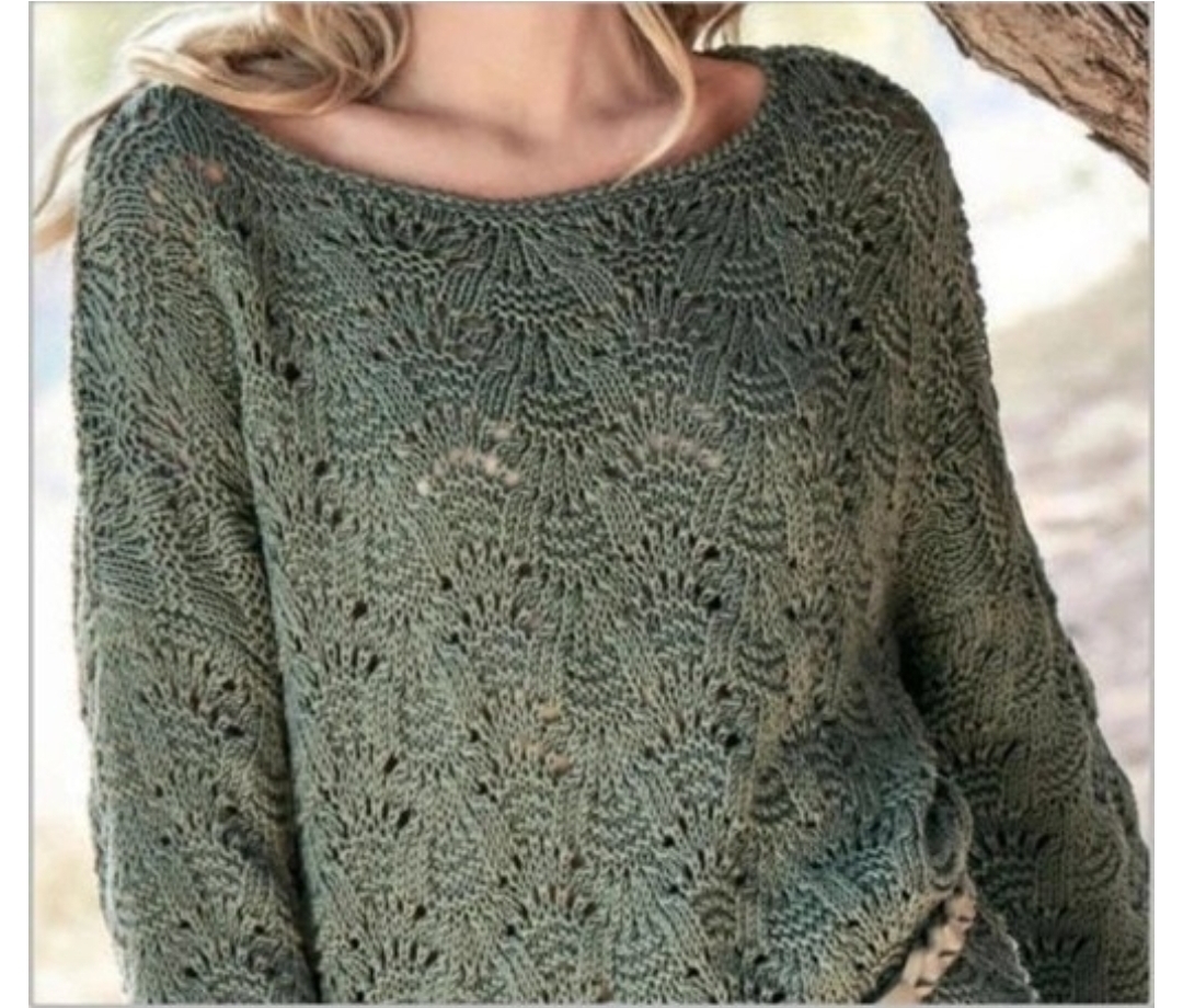 Плотность вязания: 18,5 п. х 23 р. = 10 х 10 см, связано ажурным узором спицами № 4.