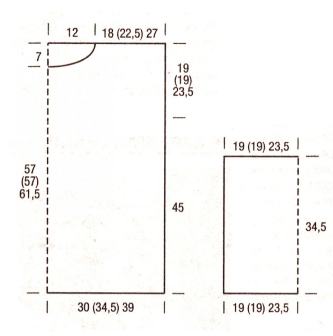 Перед: вязать, как спинку, но с круглой горловиной. Для этого через 57 см = 132 р. (57 см = 132 р.) 61,5 см = 142 р. от наборного ряда закрыть для формирования горловины средние 24 (25) 24 п. и далее каждую сторону вязать отдельно. Для закругления горловины закрыть с внутреннего края в каждом 2-м р. 1 раз 3 п., 1 раз 2 п. и 5 раз по 1 п.