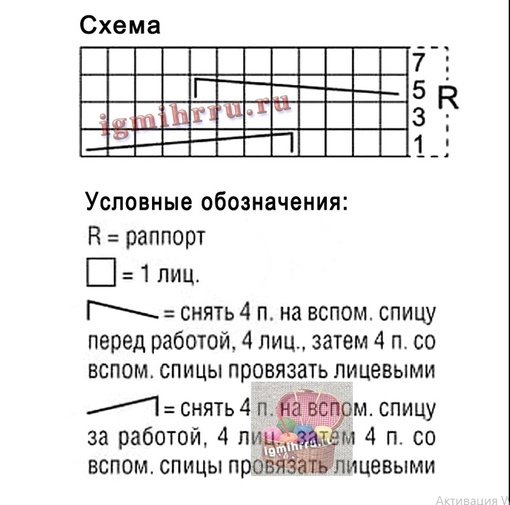 Узор «Коса»: вязать по схеме, на которой даны только лицевые ряды. В изнаночных рядах все петли вязать изнаночными.