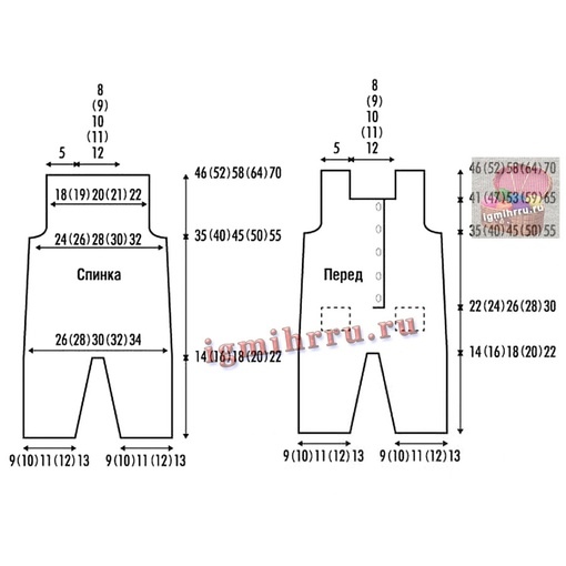 Задняя половина комбинезона, правая штанина: вязать симметрично левой штанине.