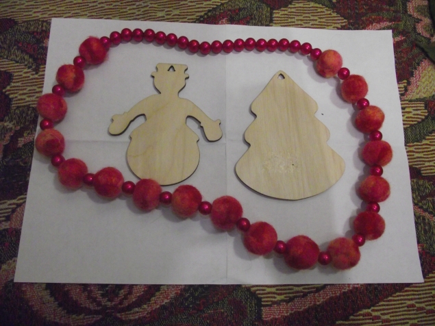 В обрамлении бус деревянные фигурки - основы для декупажа.