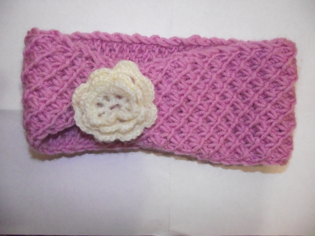 А это вязанная повязка. Жаль, что Иринке по размеру немного не подошла, но наша кроха нисколько не расстроилась и теперь эта замечательная повязочка украшает Иришкину куклу!
