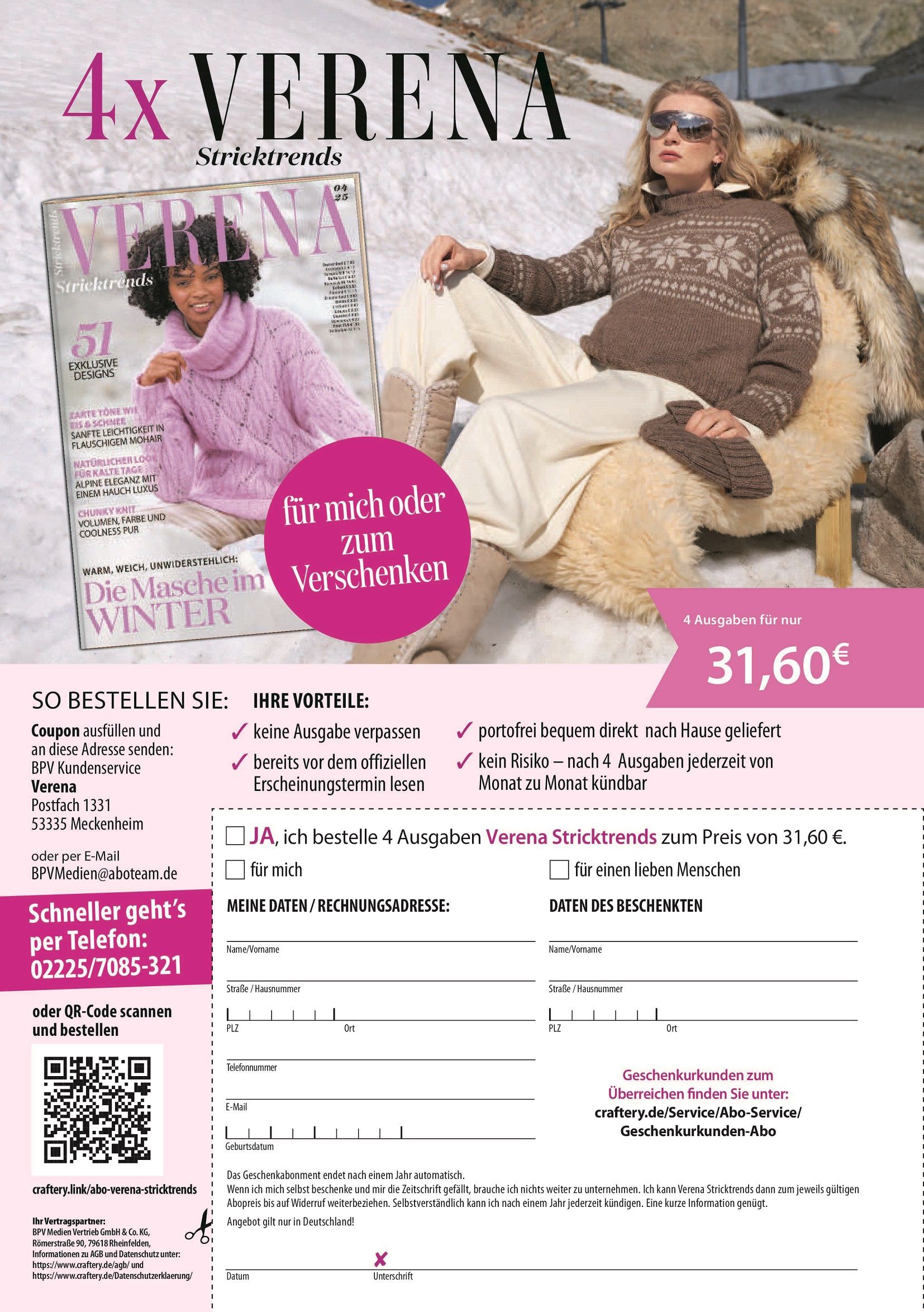 Журнал по вязанию на спицах и крючком на немецком языке для всей семьи. В новом выпуске представлена коллекция прекрасных, эксклюзивных схем вязания для мягких зимних изделий. Насыщенные цветовые контрасты привнесут яркость в ваше вязание. Насладитесь зимней лёгкостью пушистого мохера или, если вы спешите, откройте для себя вместе с нами объёмную вязку: объём, цвет и истинную прохладу для вязаных изделий!