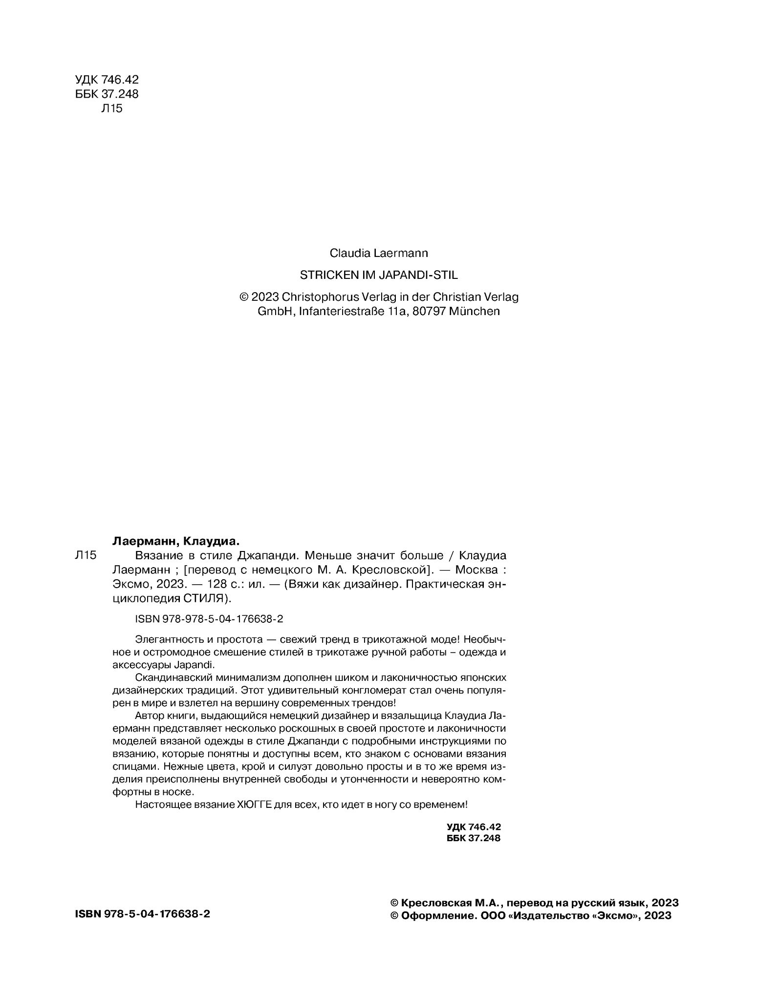 Элегантность и простота – свежий тренд в трикотажной моде! Необычное и остромодное смешение стилей в трикотаже ручной работы – одежда и аксессуары Japandi. Автор книги, выдающийся немецкий дизайнер и вязальщица Клаудиа Лаерманн представляет несколько роскошных в своей простоте и лаконичности моделей вязаной одежды в стиле Джапанди с подробными инструкциями по вязанию.