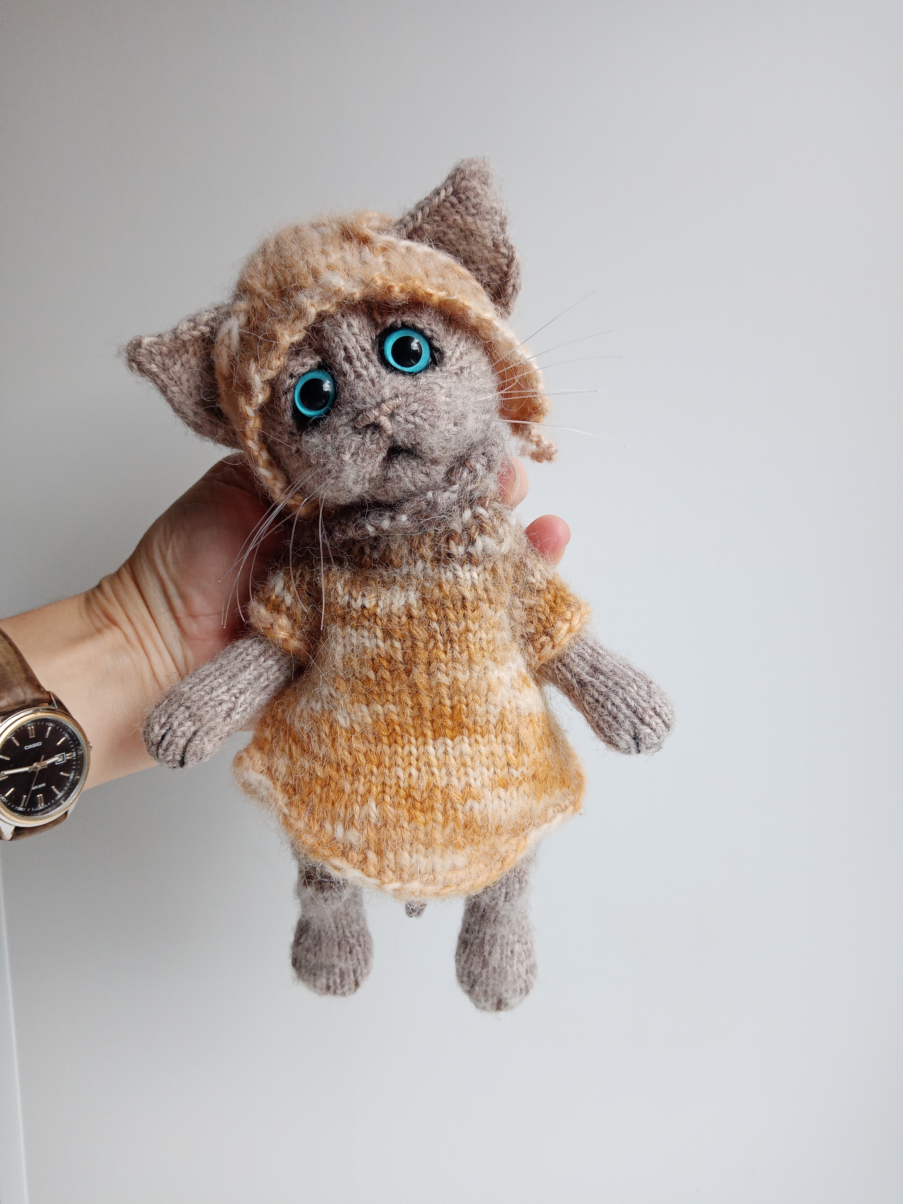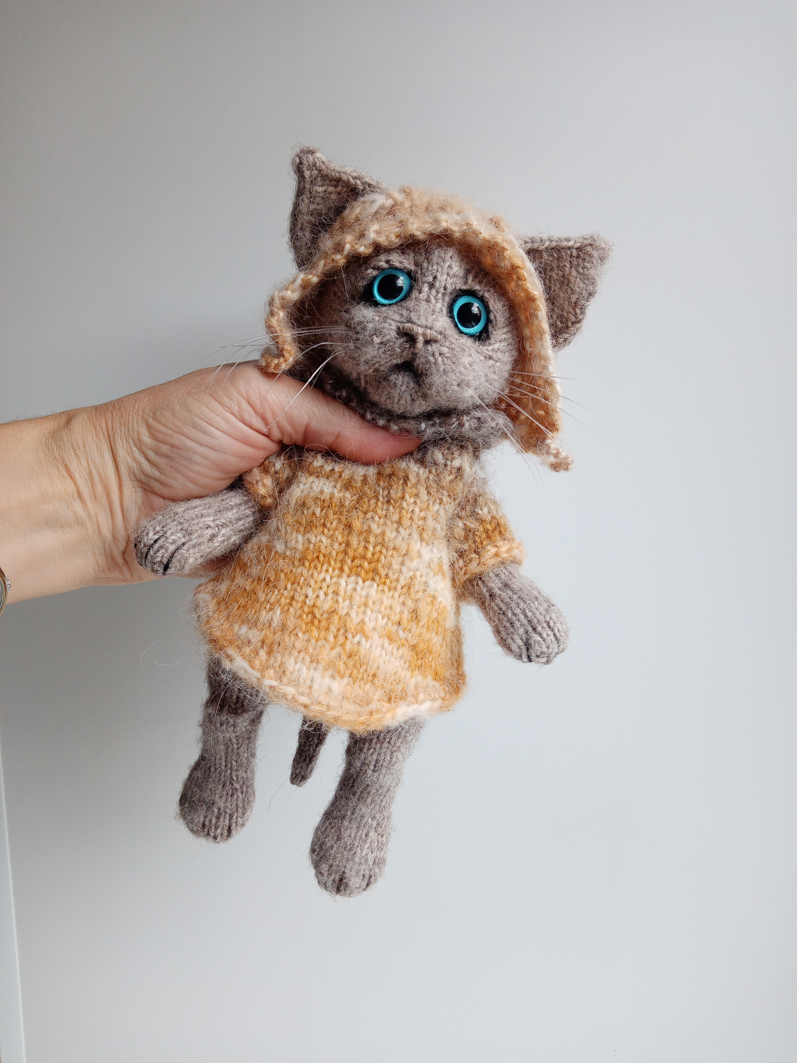 Представьте себе маленького котика, не обычного, а вязаного! Ростом всего 25 сантиметров, связанного из мягкой пряжи, он кажется невероятно уютным. Его тельце, связанное спицами с любовью, облачено в крошечный свитерок и очаровательную шапочку, подобранную в тон.