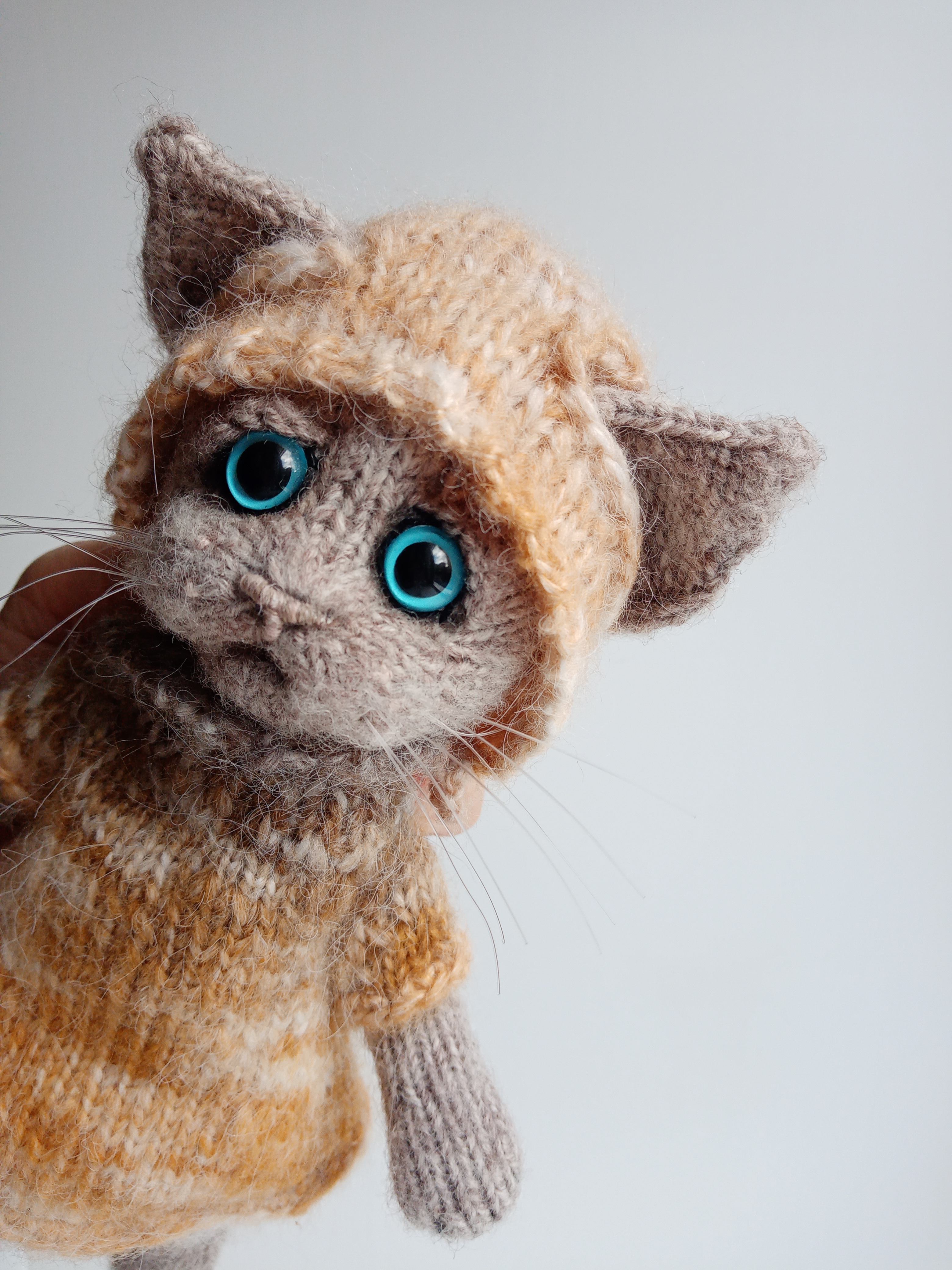 Но самое удивительное в этом вязаном чуде – его глазки. Они совсем не похожи на пуговки, а как настоящие, живые, смотрят с любопытством и теплом. Кажется, будто этот котик вот-вот мяукнет и попросится на ручки.