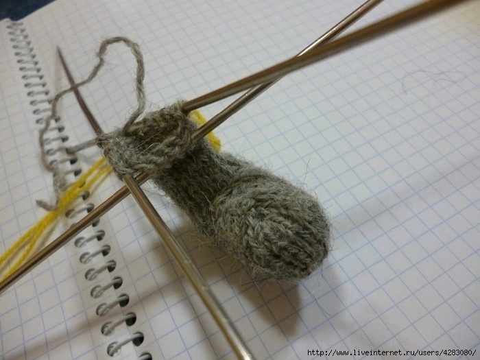 Дальше вяжем по кругу. Я вяжу на 3-х спицах четвертой.