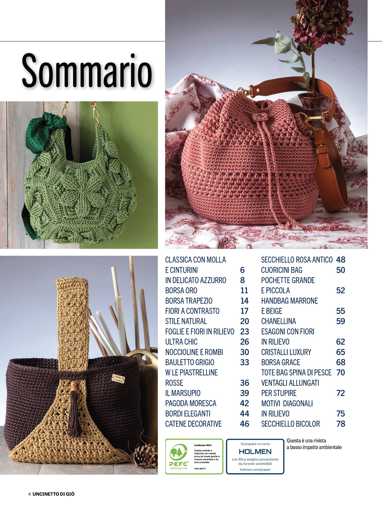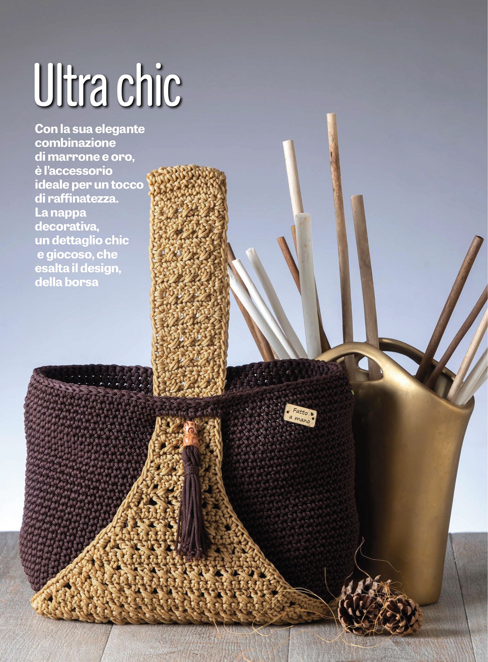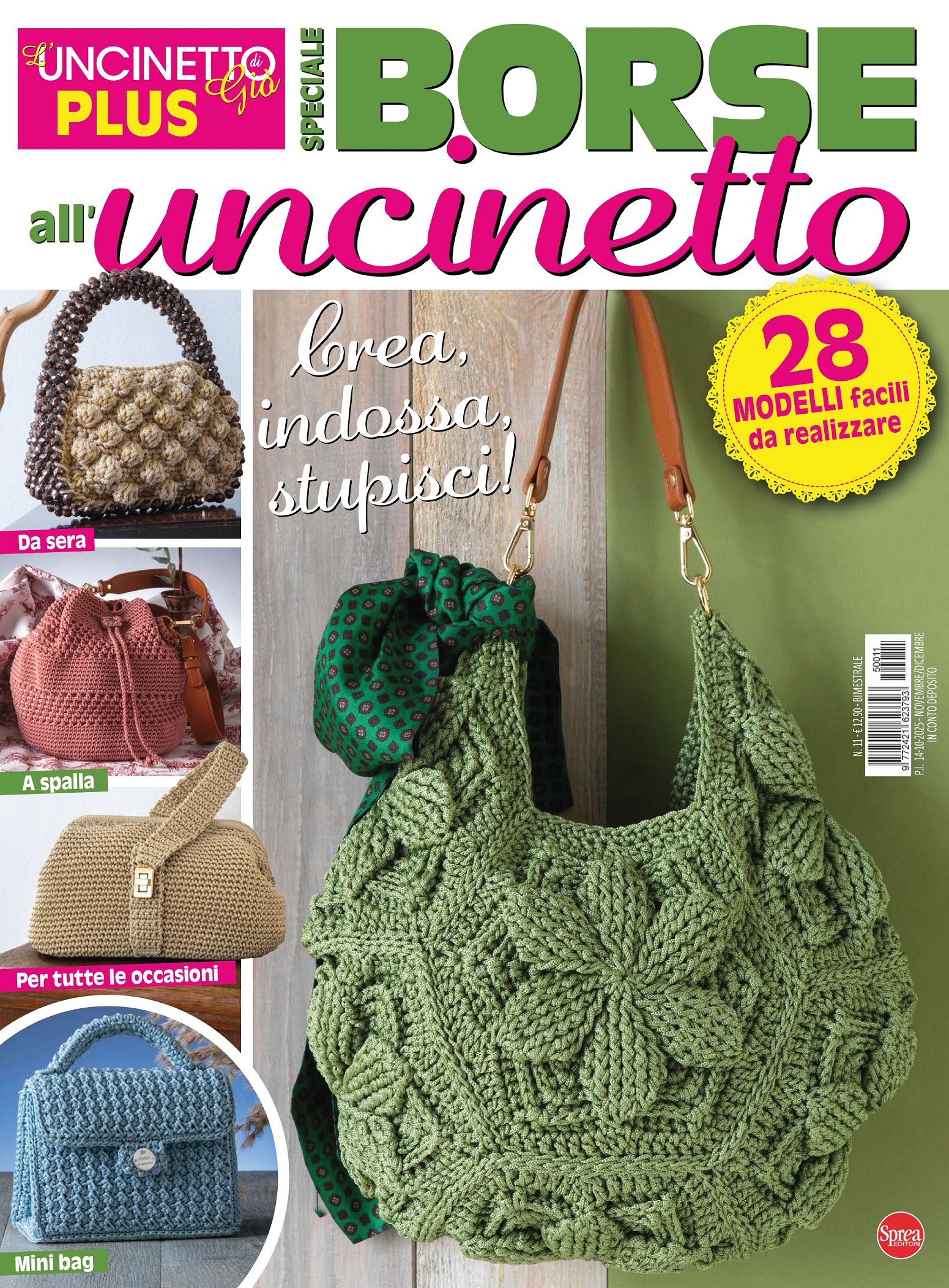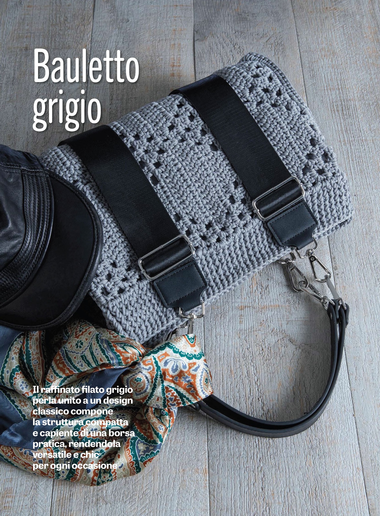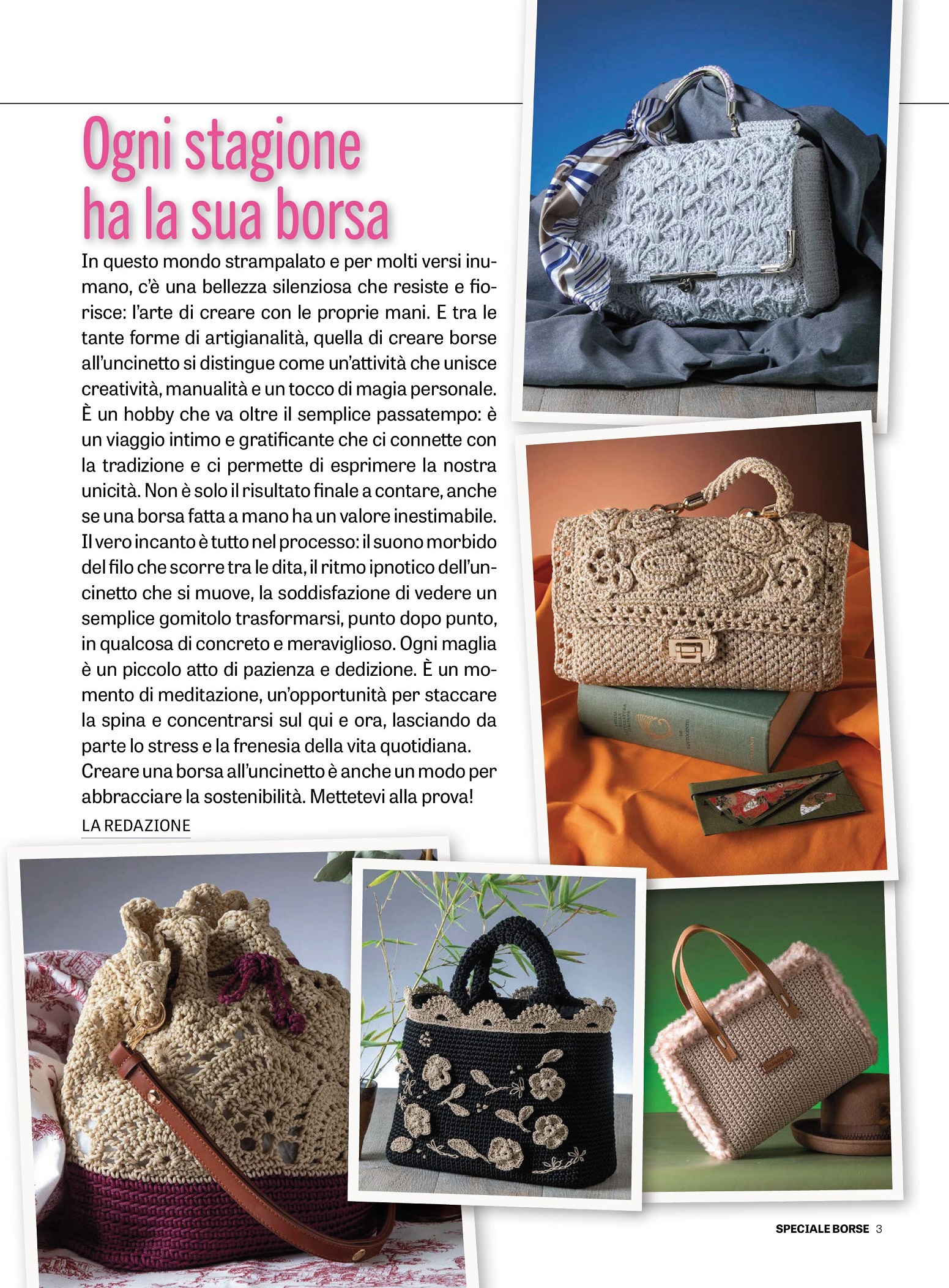 Итальянский журнал по вязанию крючком. В этом выпуске представлена красочная подборка универсальных сумок, связанных крючком. Для любого образа и любого технического уровня найдется подходящая сумка с инструкциями