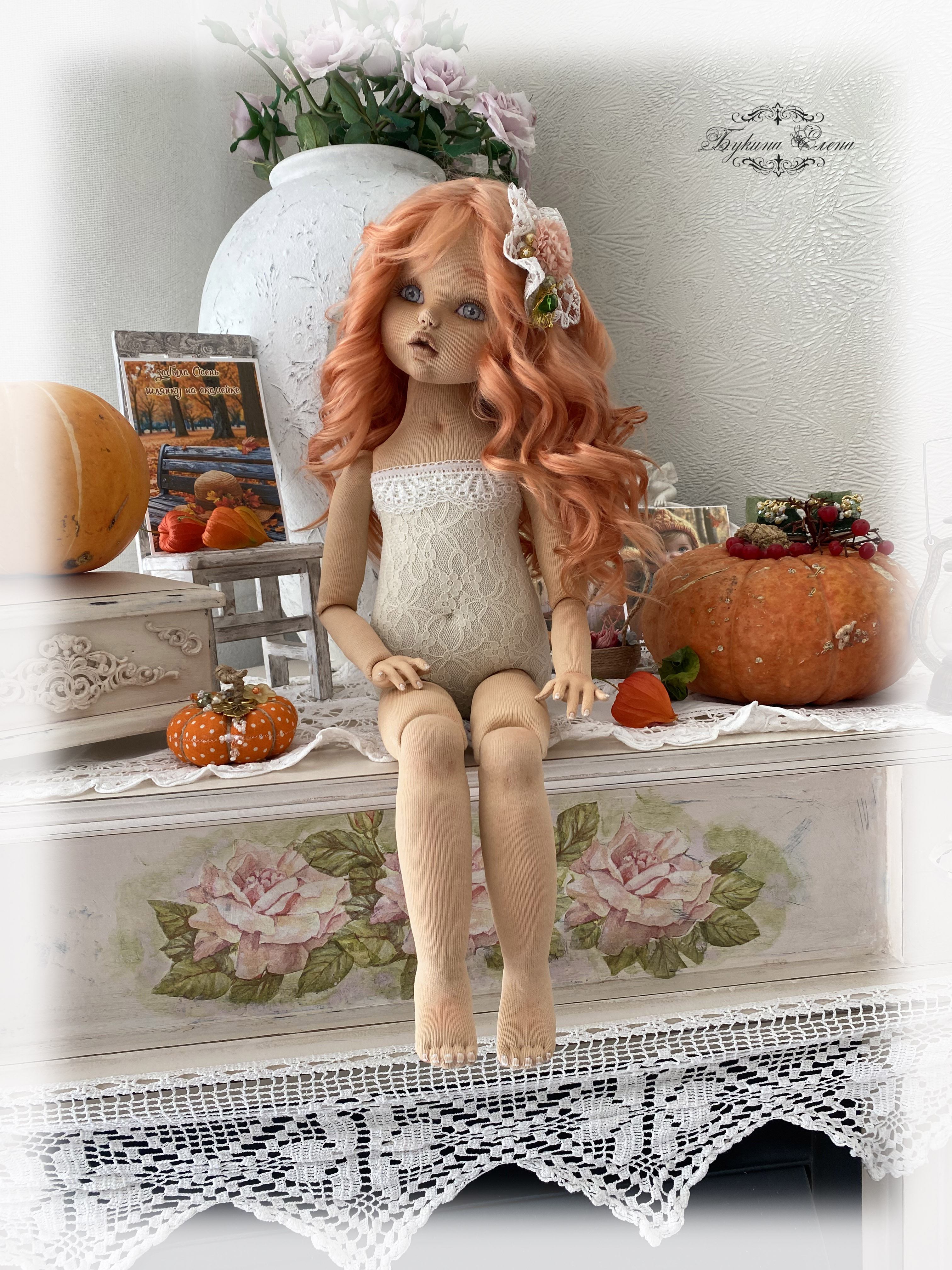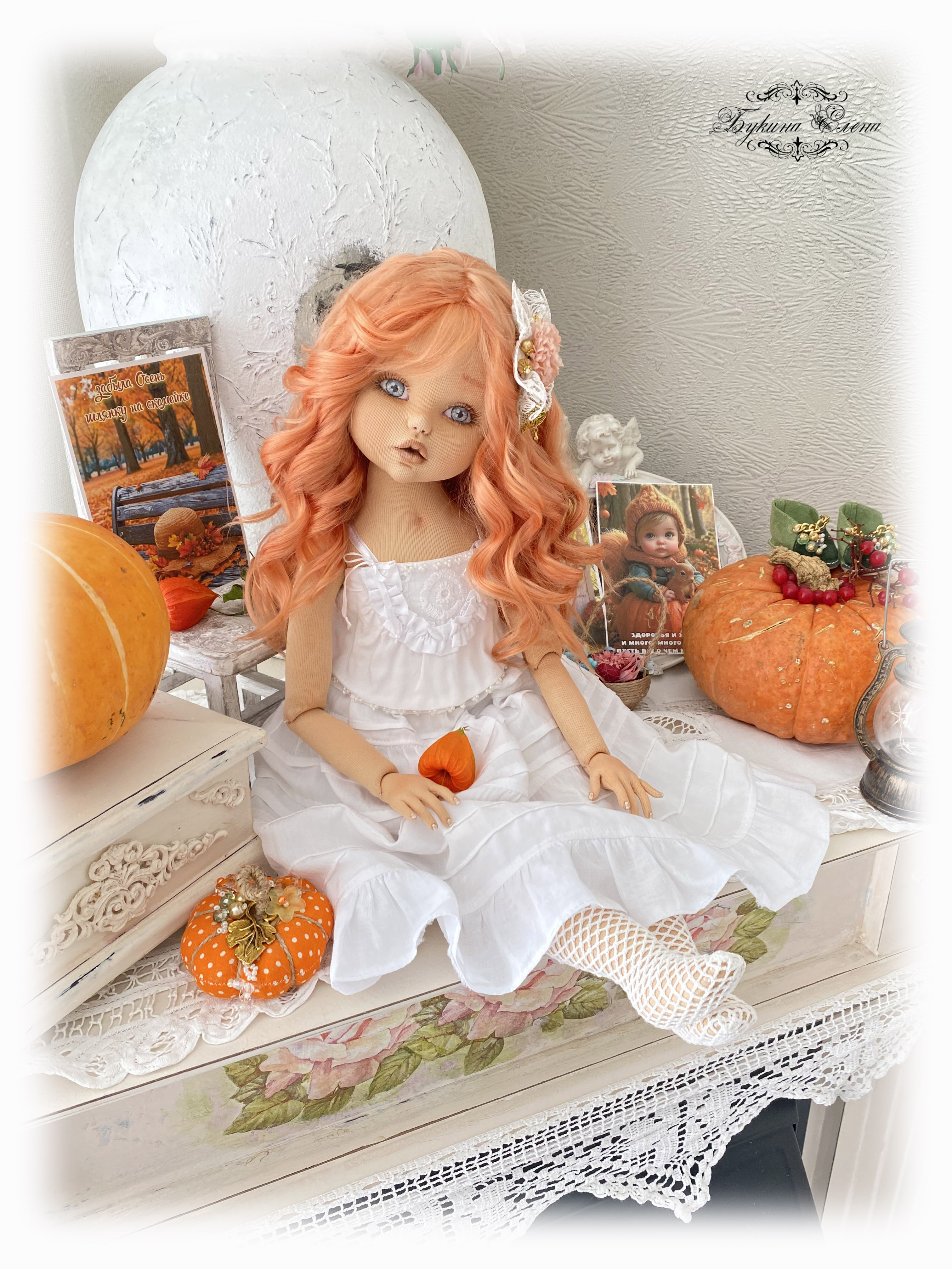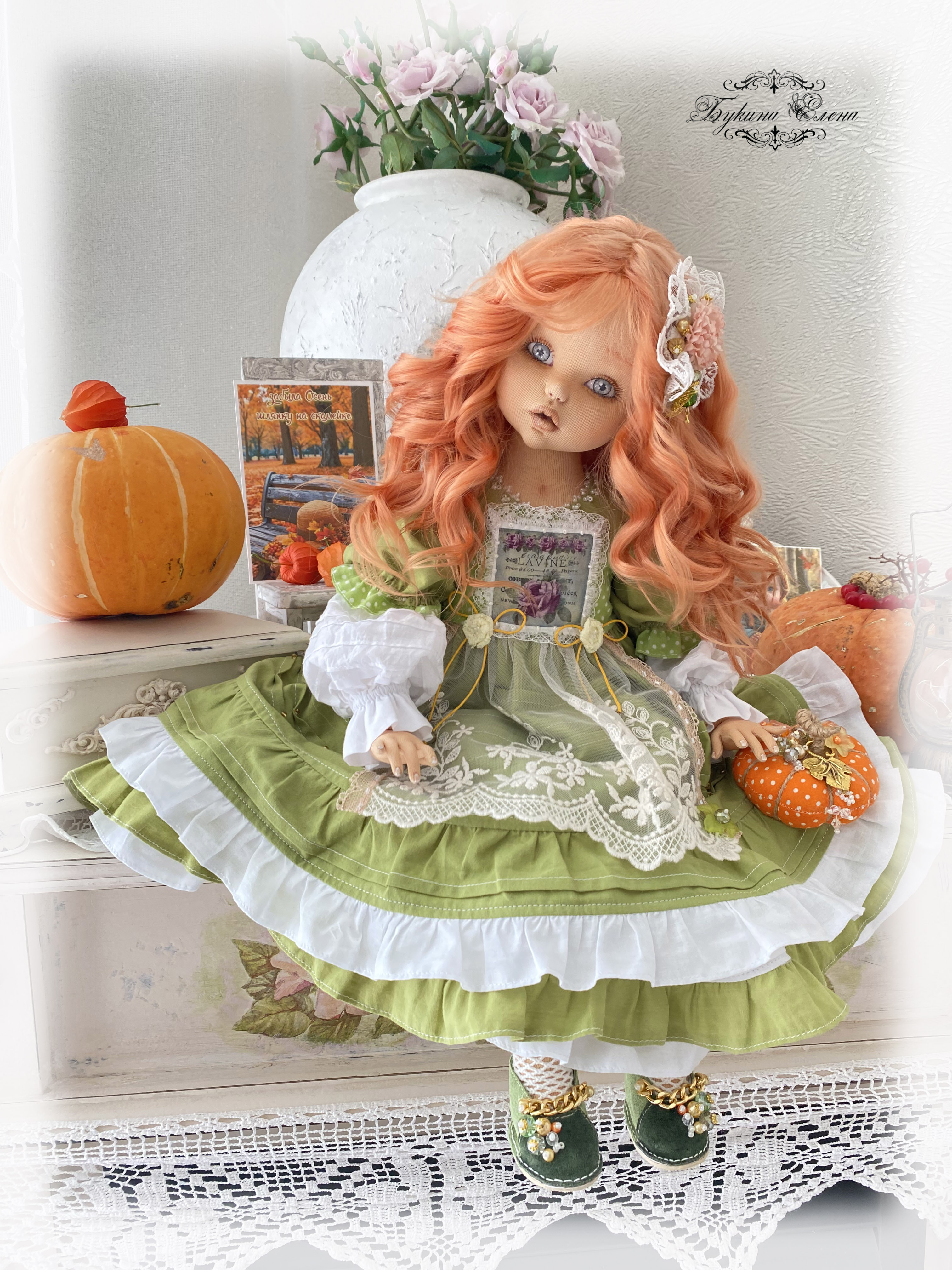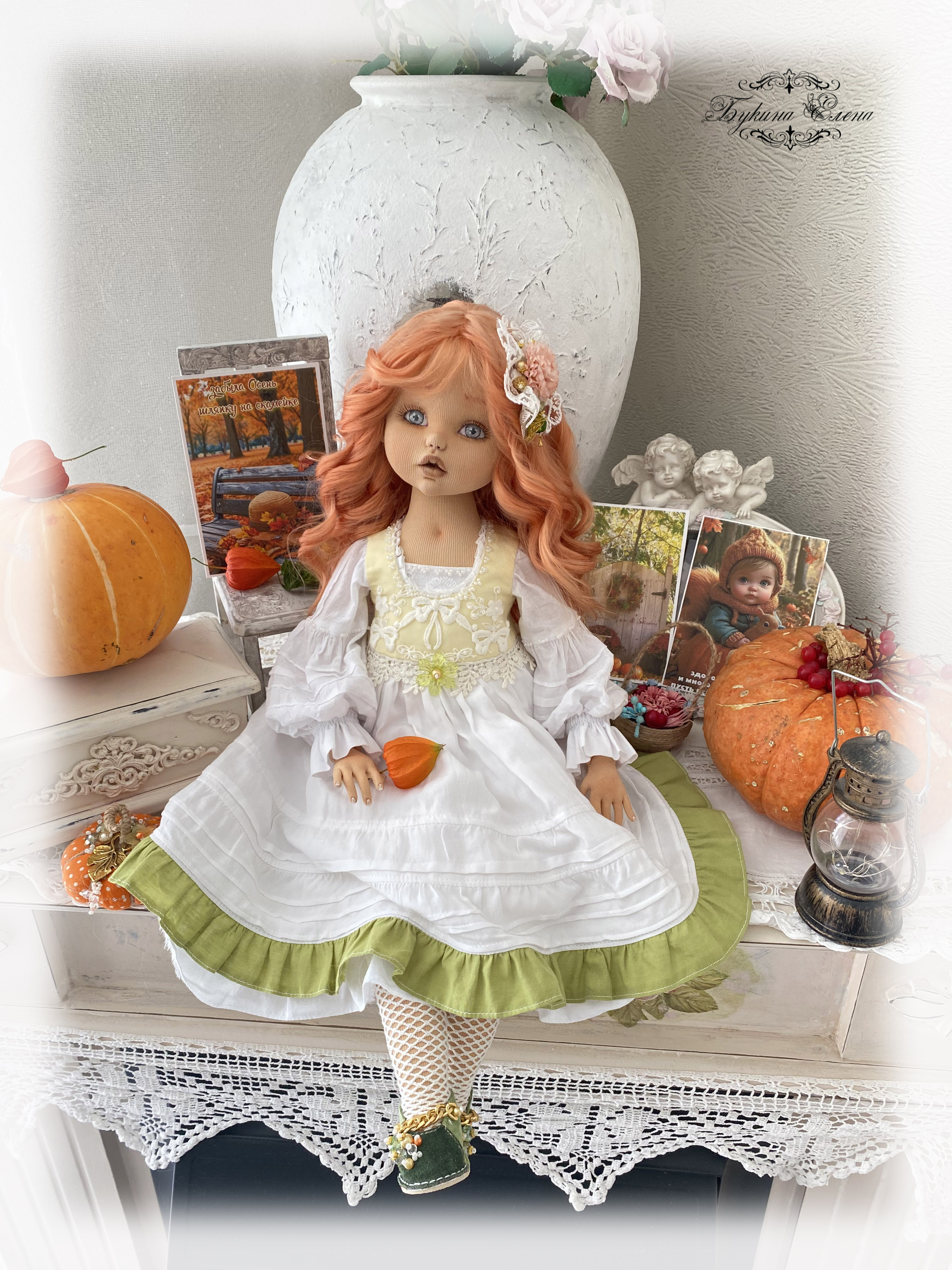 Есения, коллекционная текстильная кукла. Малышка сшита из хлопка, обтянута трикотажем. Личико объёмное. Куколка шарнирная ( 10 скрытых шарниров). Головушка крутится и немного наклоняется. Есения сидит самостоятельно. Пальчики на ручках гнутся, есть маникюр. Волосы — натуральные шелковые локоны козочки. Прическу можно менять, завивать и выпрямлять. Вся одежда съёмная, сшита в осенней тематике. Наряд сшит из хлопка, батиста, кружевного полотна, украшен кружевом, шебби лентами, бисером. Туфельки сшиты из натуральной замши. У малышки есть тыква и корзинка. Рост Есении около 52 см. АКТУАЛЬНА РАССРОЧКА. Паспорт и фоточки прилагаются.