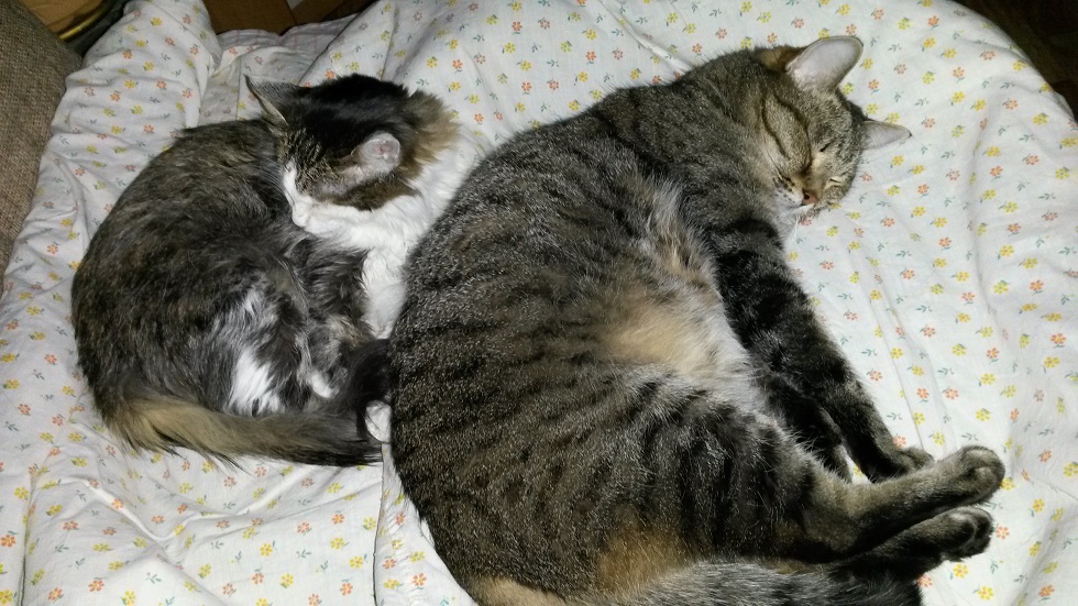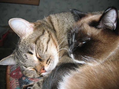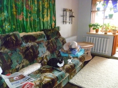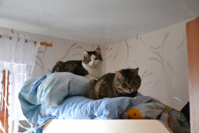 А сегодня с Людой общались, зашел разговор о кошках, - и я вспомнила! Знакомьтесь - по старшинству Масяня и Маруся) Масяню 13 лет назад подобрала в подъезде. Она крупная, 5,5 кг. Когда ей было 8 месяцев, она спрыгнула с балкона по-молодости, по-глупости, сломала бедро. Ей ставили металлический штифт, пока срослось все, потом убирали его. Раза два мы ее в травмпункт на рентген носили, врач молодец, не отказал на наши просьбы. Теперь это почтенная матрона. Но не может себе отказать в удовольствии поскакать по шкафам. Это с ее-то весом! А Марусю я взяла в этом году у девочек из общества "Хвостики" . Это молодые девочки, некоторые ветеринары по-специальности. Они спасают погибающих животных, а потом пристраивают их в хорошие руки. Марусю года полтора назад какой-то пьяный идиот вышвырнул с 9 этажа. Девочки ее вылечили, все переломы срастили. Но один глазик немного вытек и не видит, а второй с бельмом и видит она краем глаза, боком голову поворачивая.