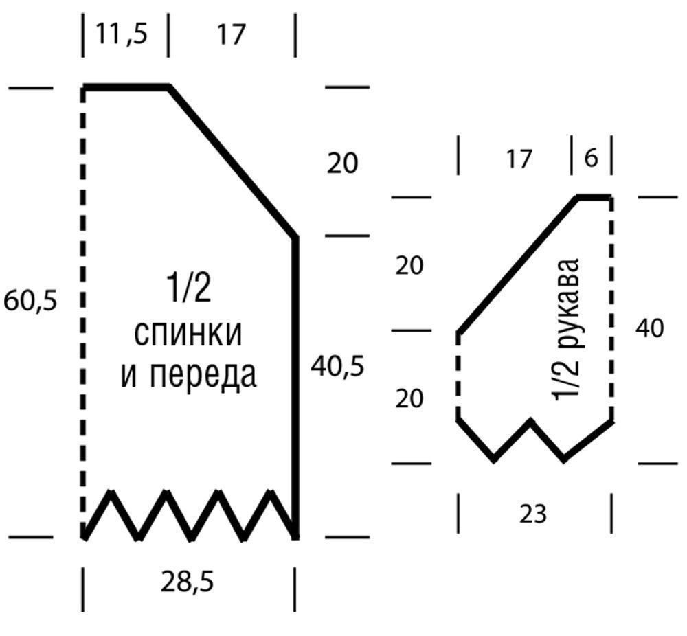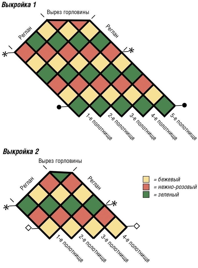 2-ю деталь вязать аналогично. При этом 1-е и 2-е полотнища начинаются у нижнего края переда и заканчиваются у левого регланного скоса переда и т.д.