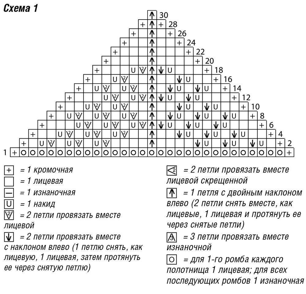Вязать согл. схеме 1. Каждый ромб начать с 1 изнаночного ряда и закончить 1 лицевым рядом. На схеме даны лицевые ряды, а также 1-й изнаночный ряд, включая кромочные.