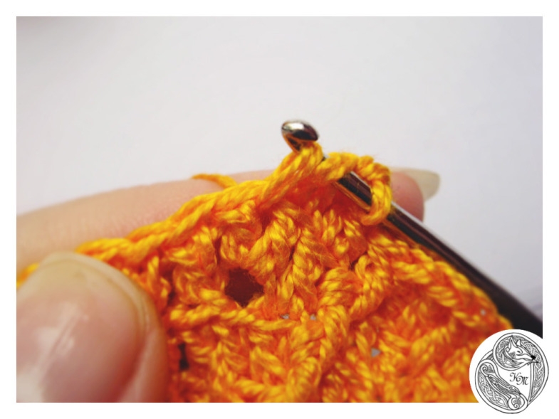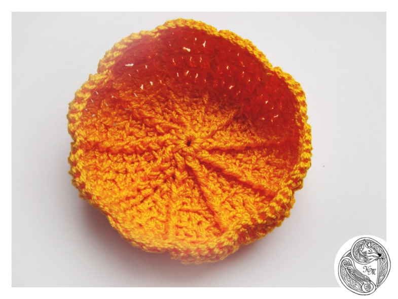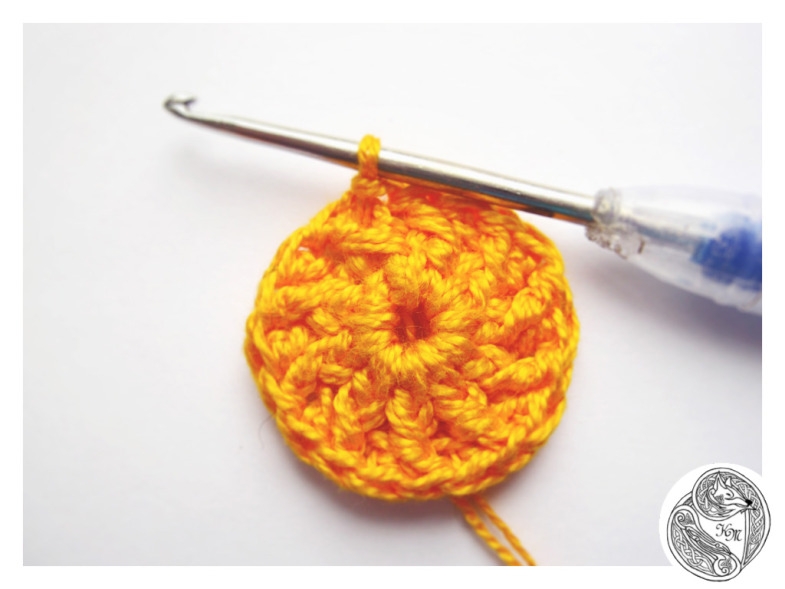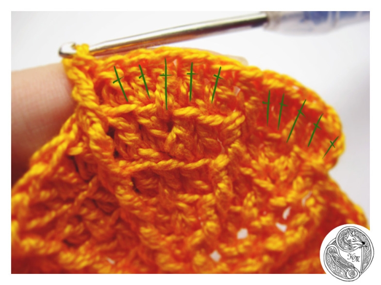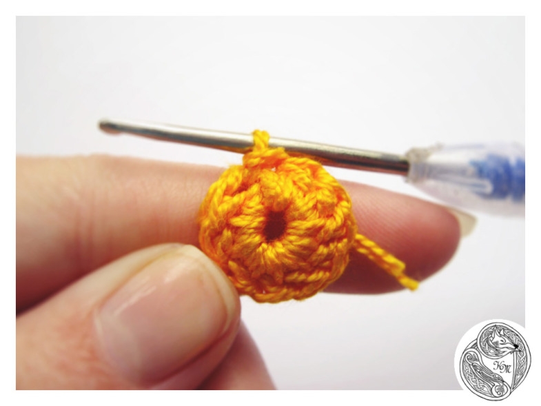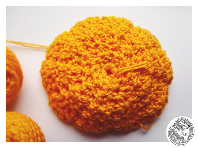 В следующем ряду мы делаем прибавки и начинаем вывязывать ложбинки на нашей тыковке. Для этого из каждого столбика предыдущего ряда провязываем один обычный столбик с накидом и один рельефный столбик с накидом (вводим крючок не в петлю, а под столбик) (итого 20 ст. с/н по кругу).