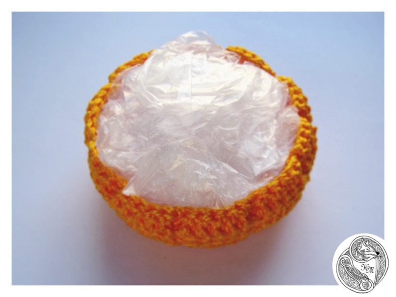 Для того, чтобы шкатулка хорошо держала форму, ее необходимо жестко накрахмалить. Т.к. у меня нет подходящей формы для просушки, я придаю тыкве форму, набивая ее целлофановыми пакетиками.