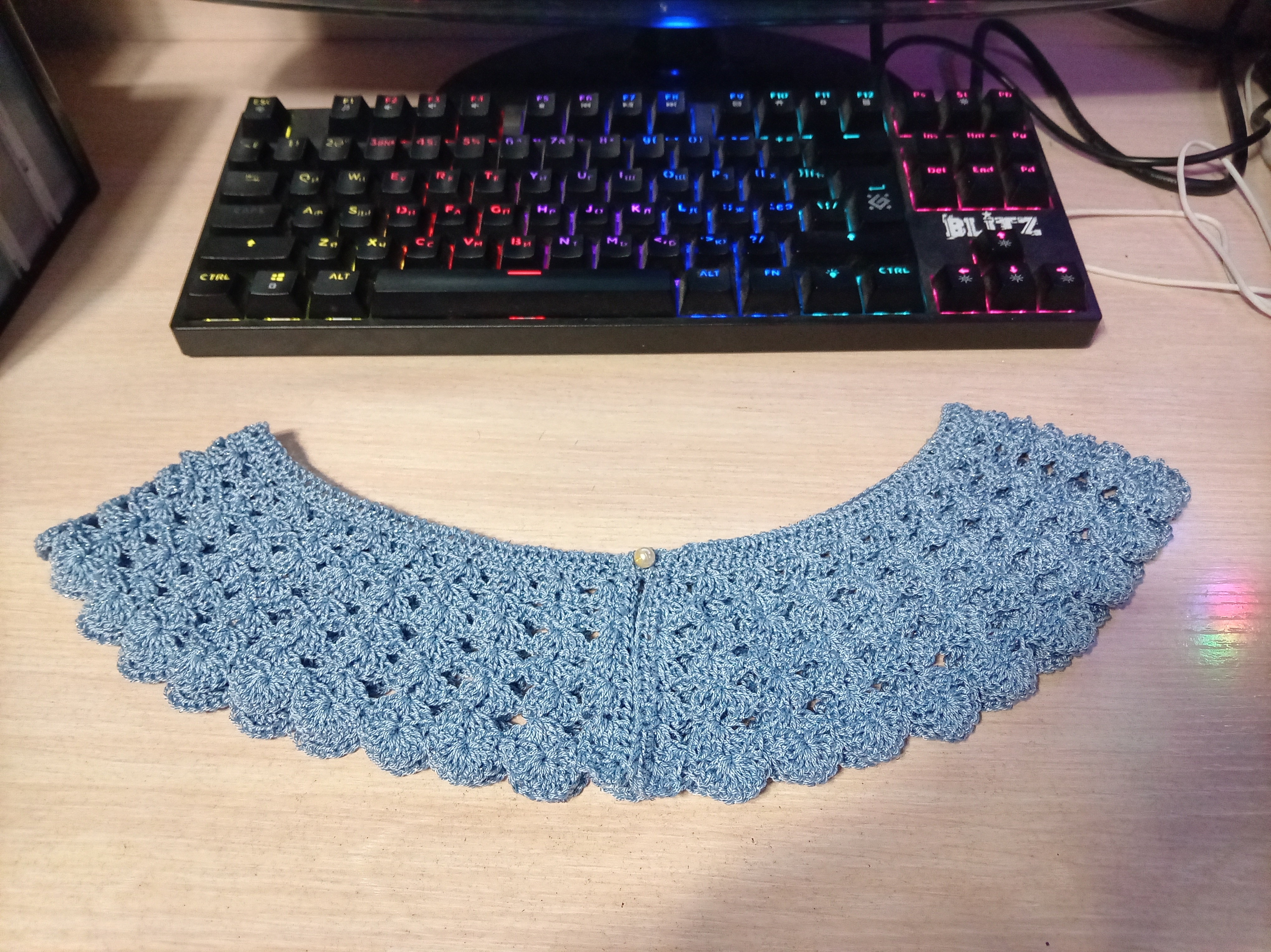 Очень люблю вязать. Не так давно закончила вязание воротничка к блузке. Очень нарядно и красиво. К сожалению фото не передаёт блеск пряжи.