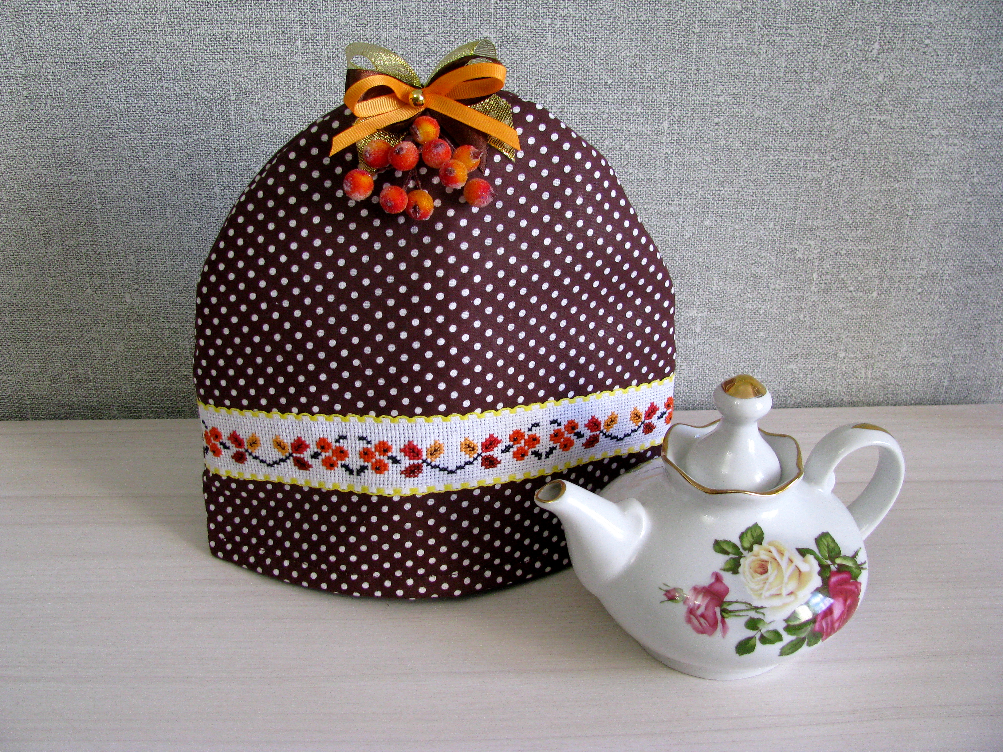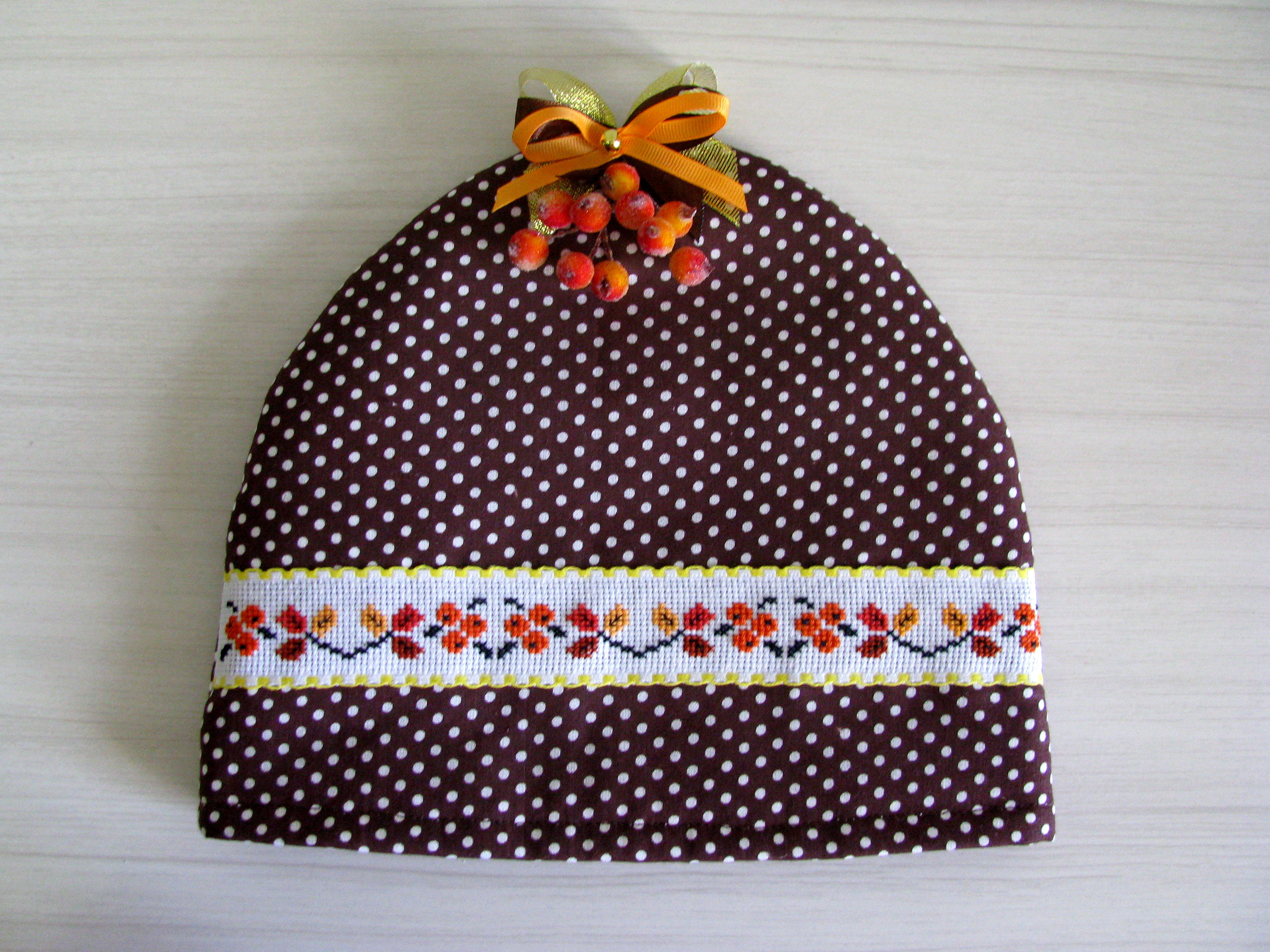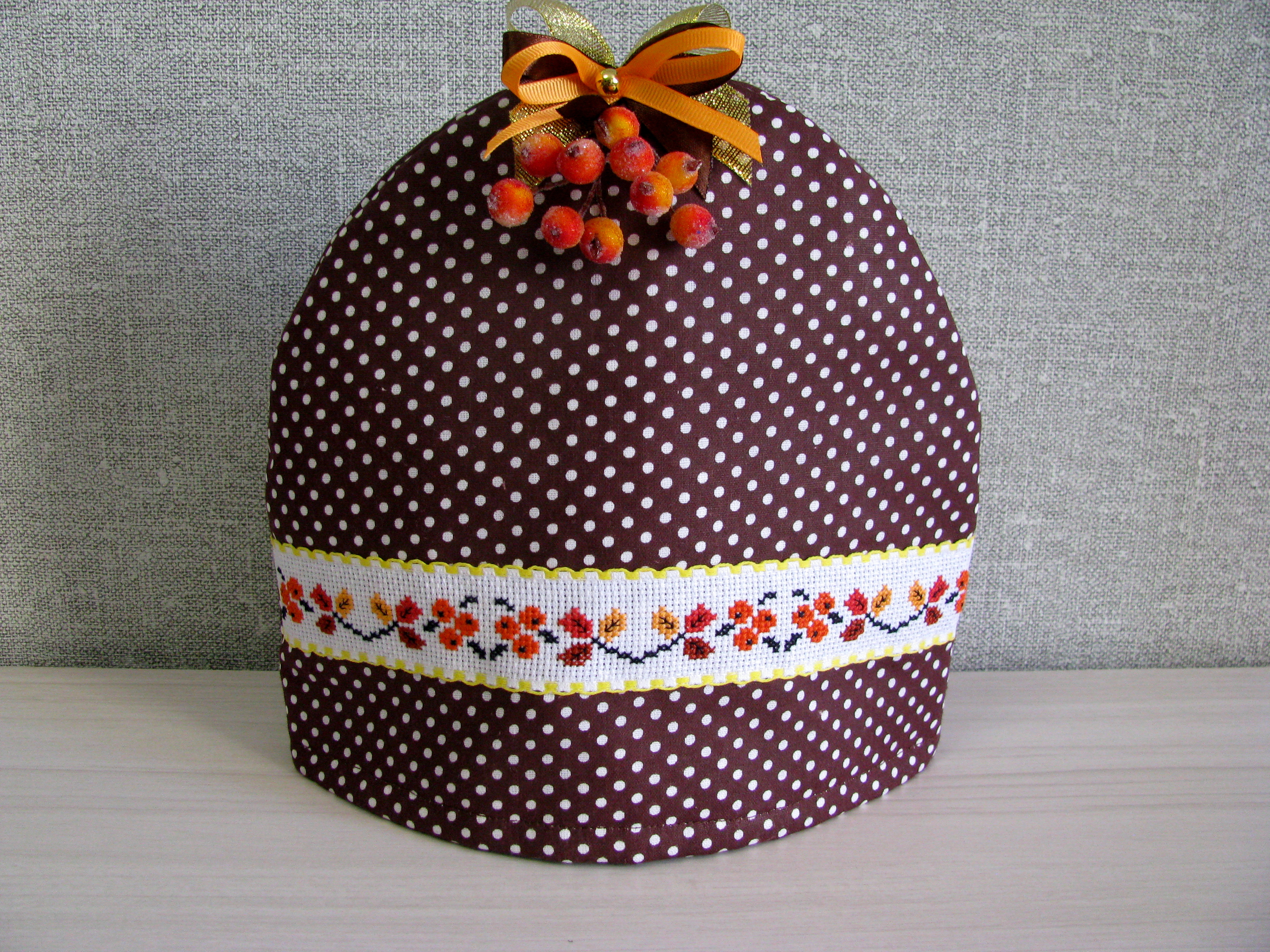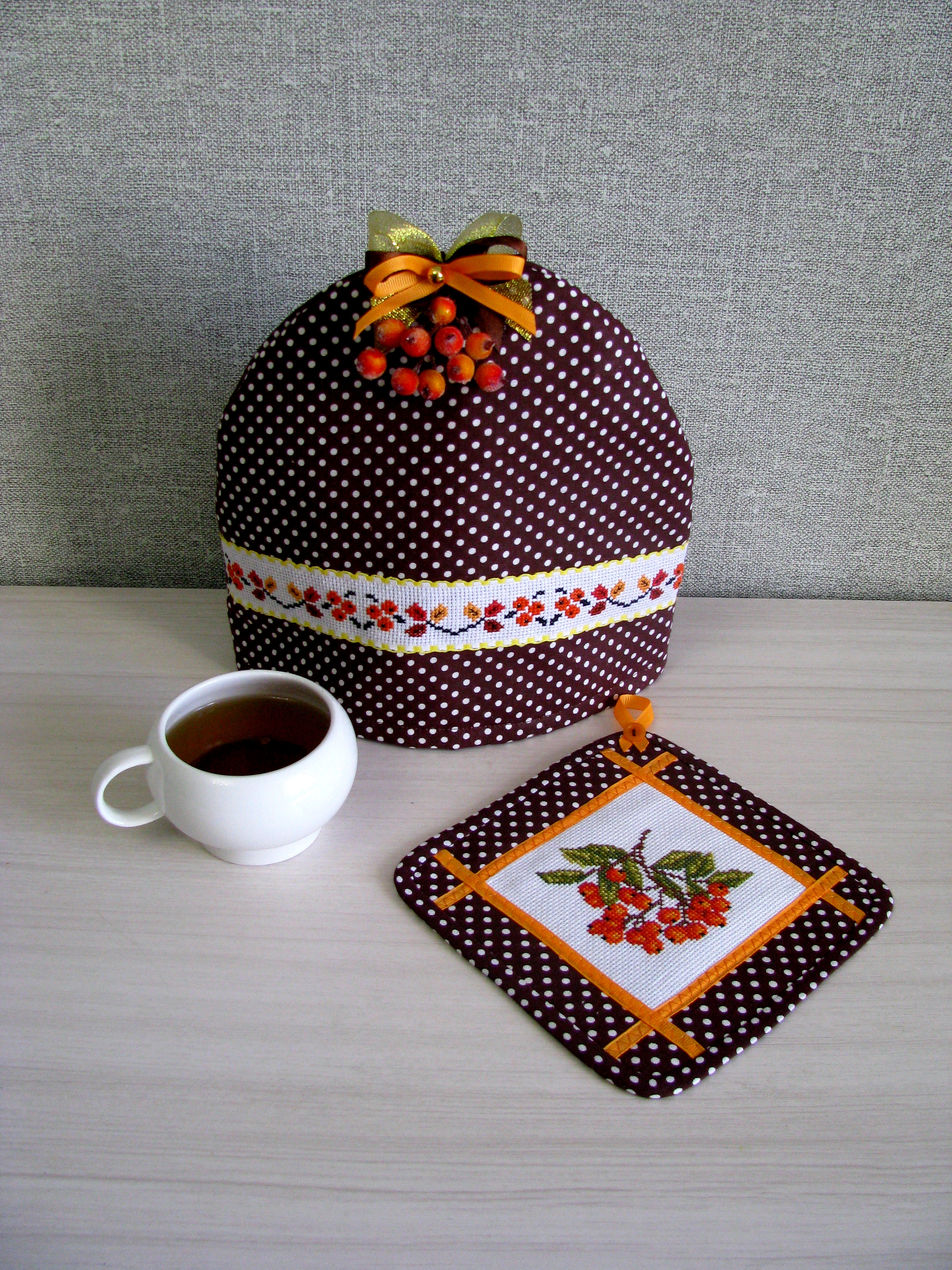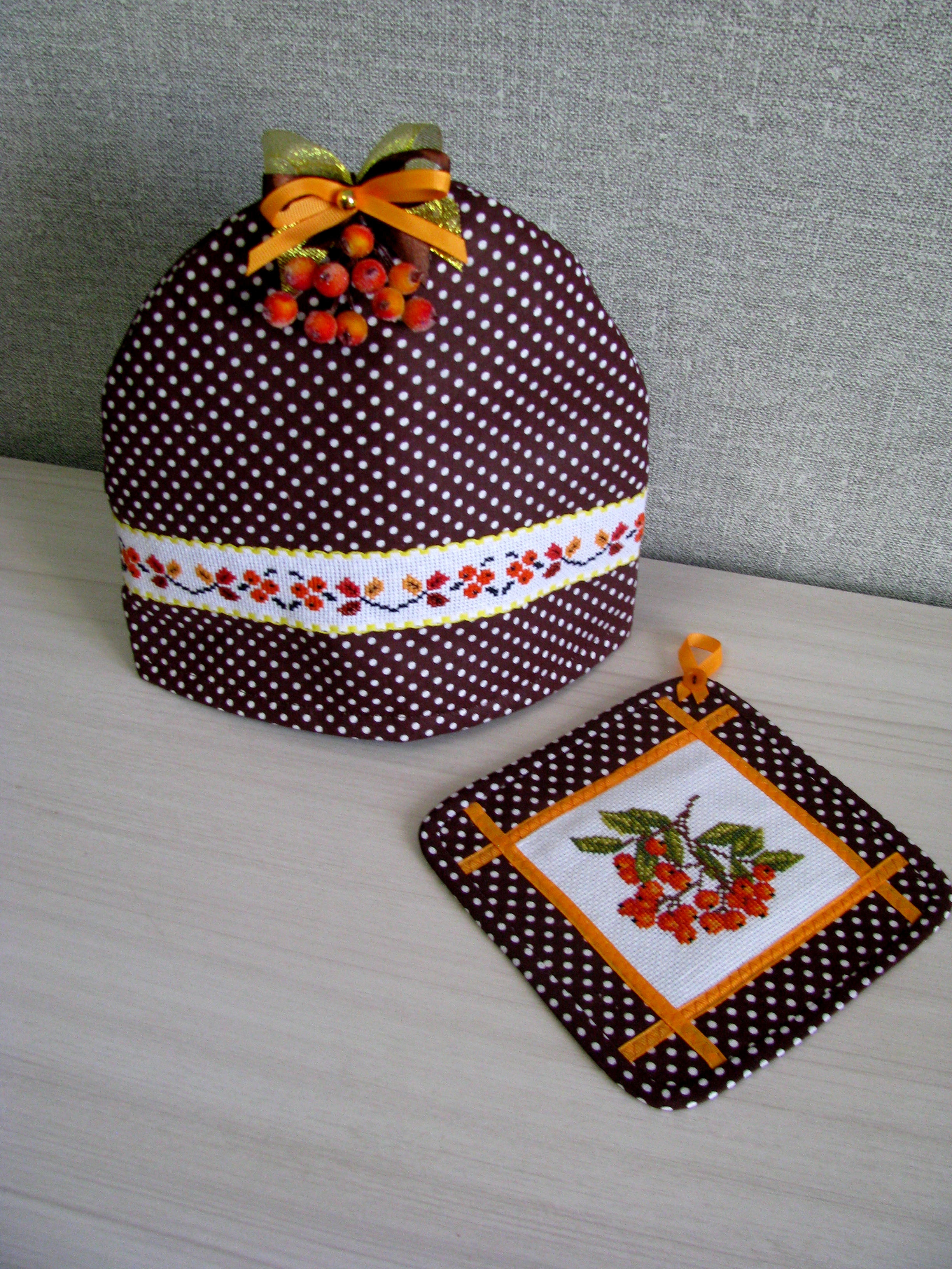 Представляю на конкурс "Осенние фантазии" комплект "Рябина". Он состоит из прихватки и грелки на чайник. Сшит из коричневой бязи в горошек. Украшен ручной вышивкой крестом с осенними мотивами. Грелка декорирована флористической композицией с ягодами рябины.