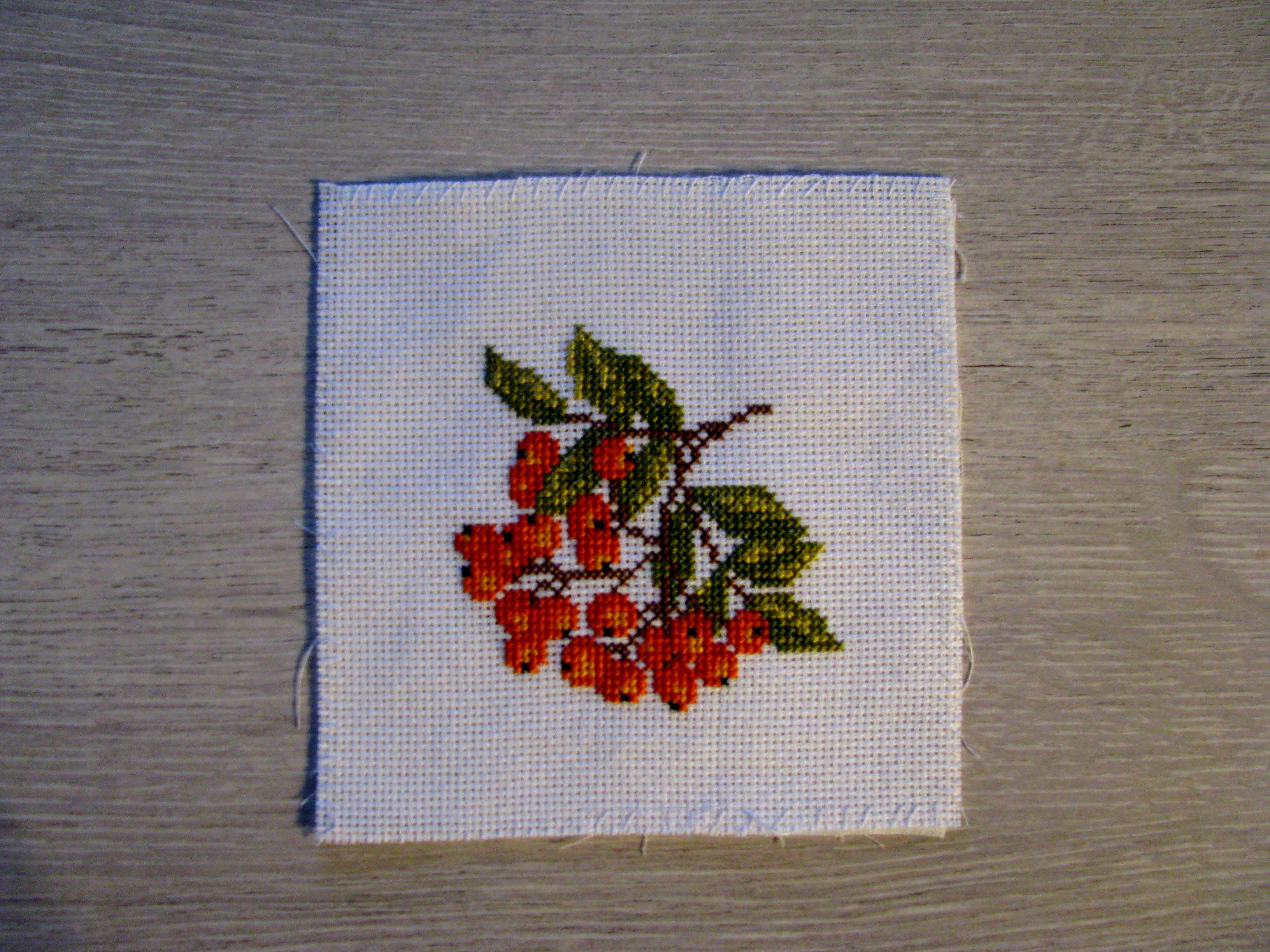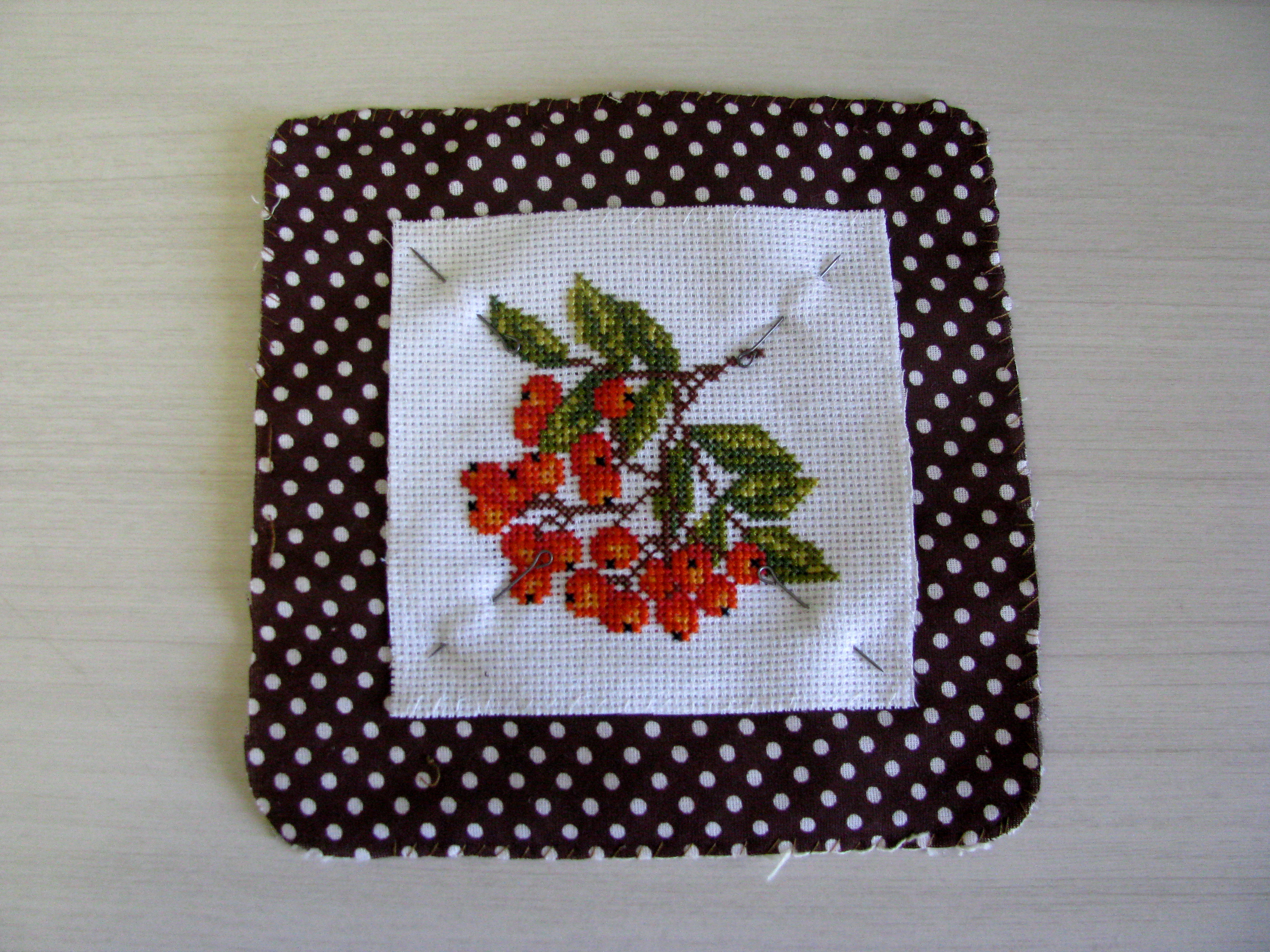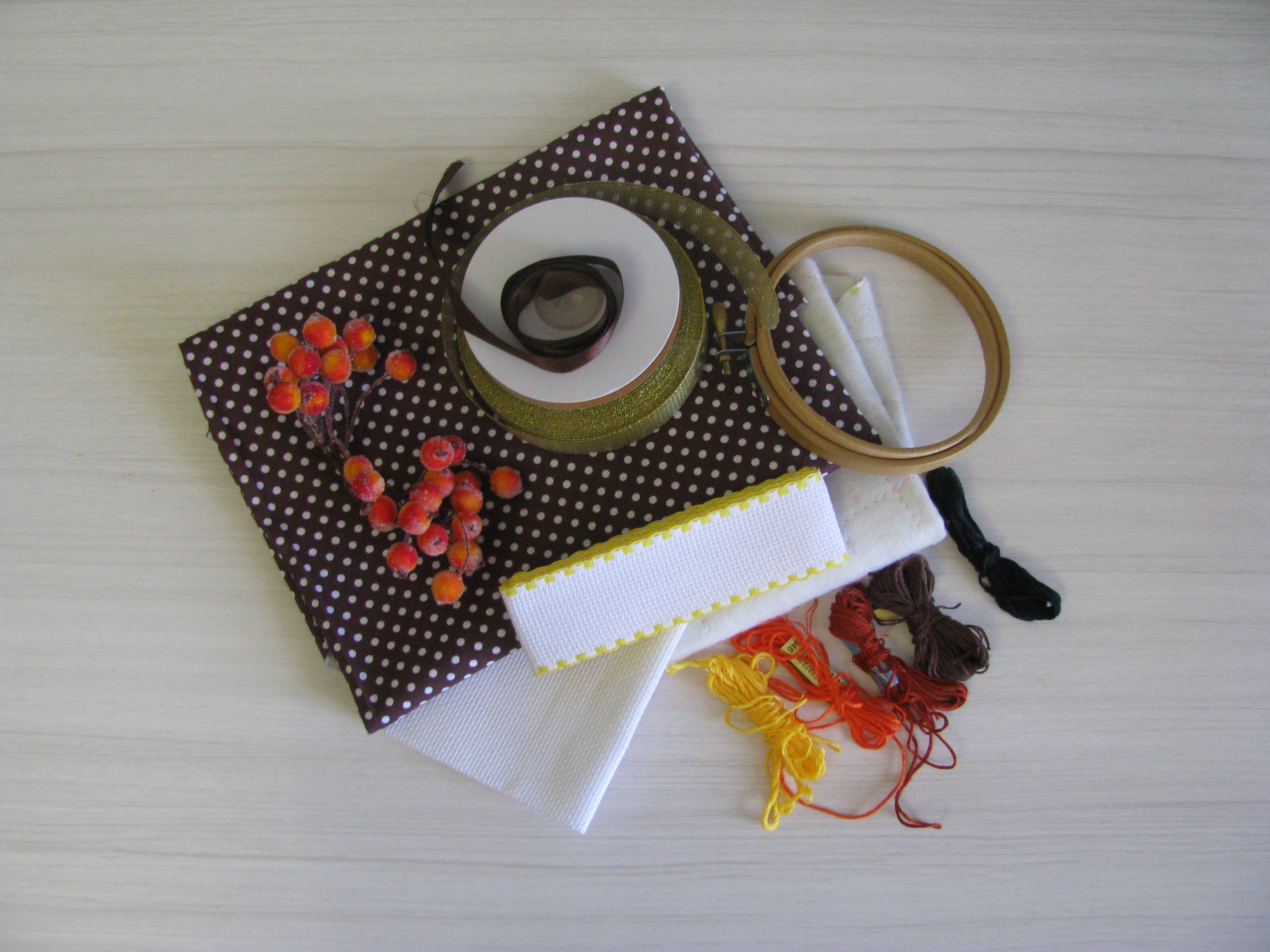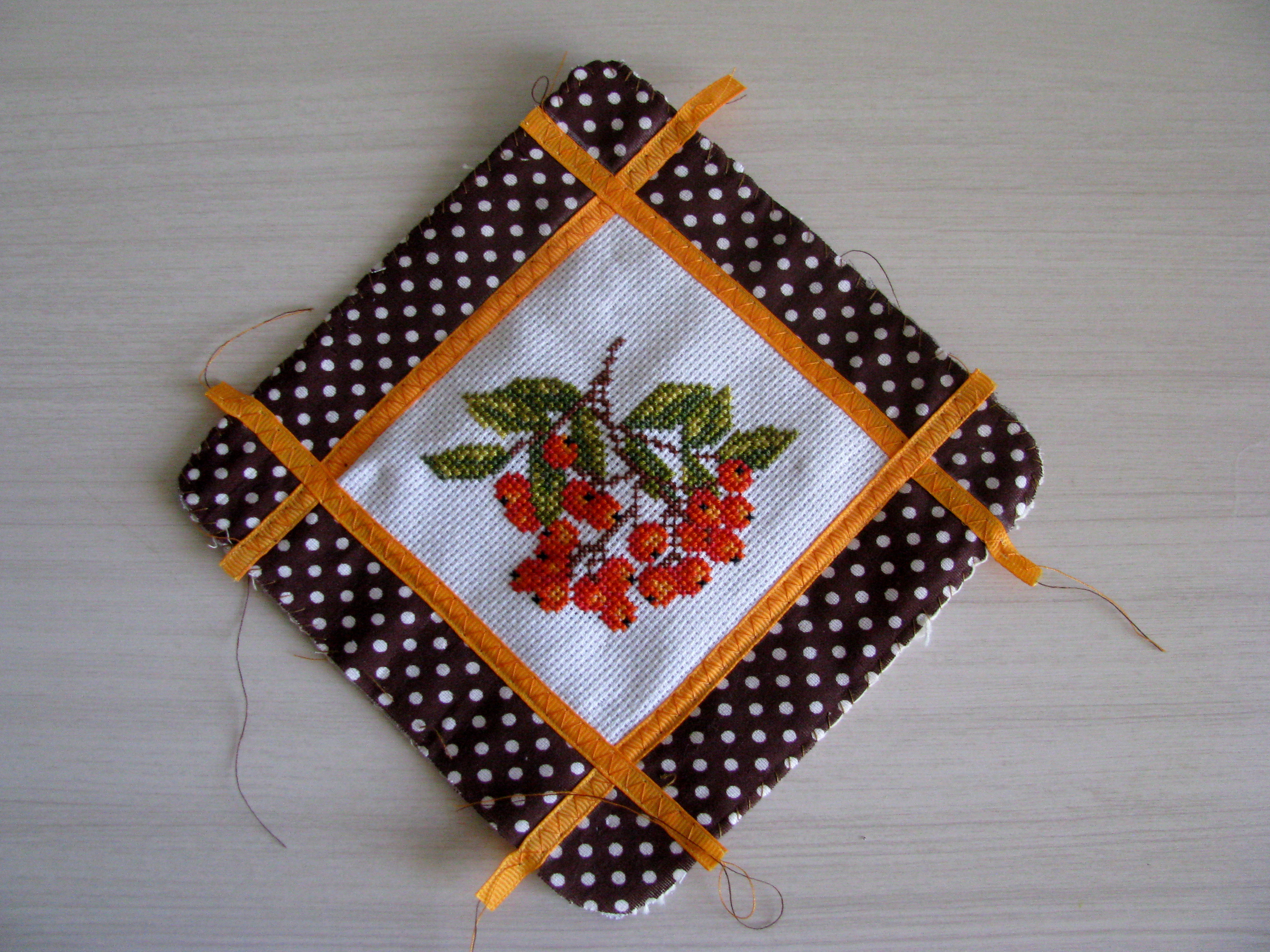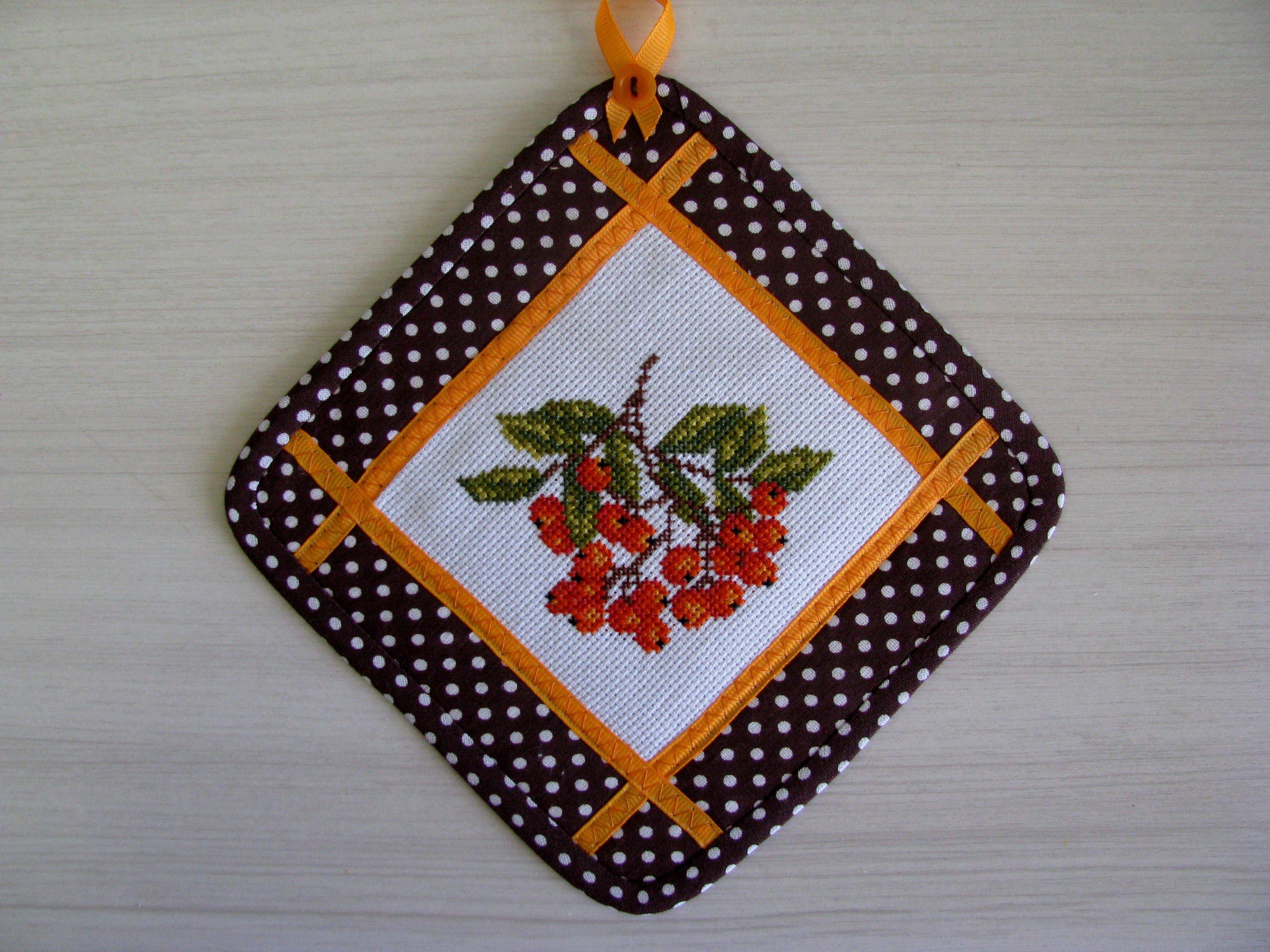 Представляю на конкурс "Осенние фантазии" комплект "Рябина". Он состоит из прихватки и грелки на чайник. Сшит из коричневой бязи в горошек. Украшен ручной вышивкой крестом с осенними мотивами. Грелка декорирована флористической композицией с ягодами рябины.