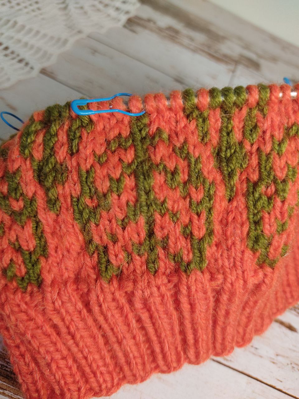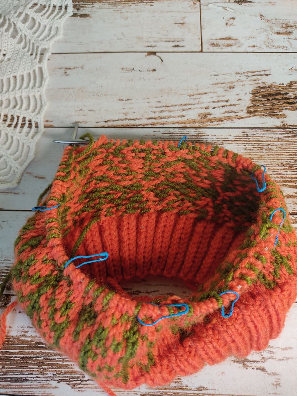 Также повесила маркеры, распределив узор. Маркеры для вязания можно заменить петельками из остатков пряжи от предыдущих проектов.