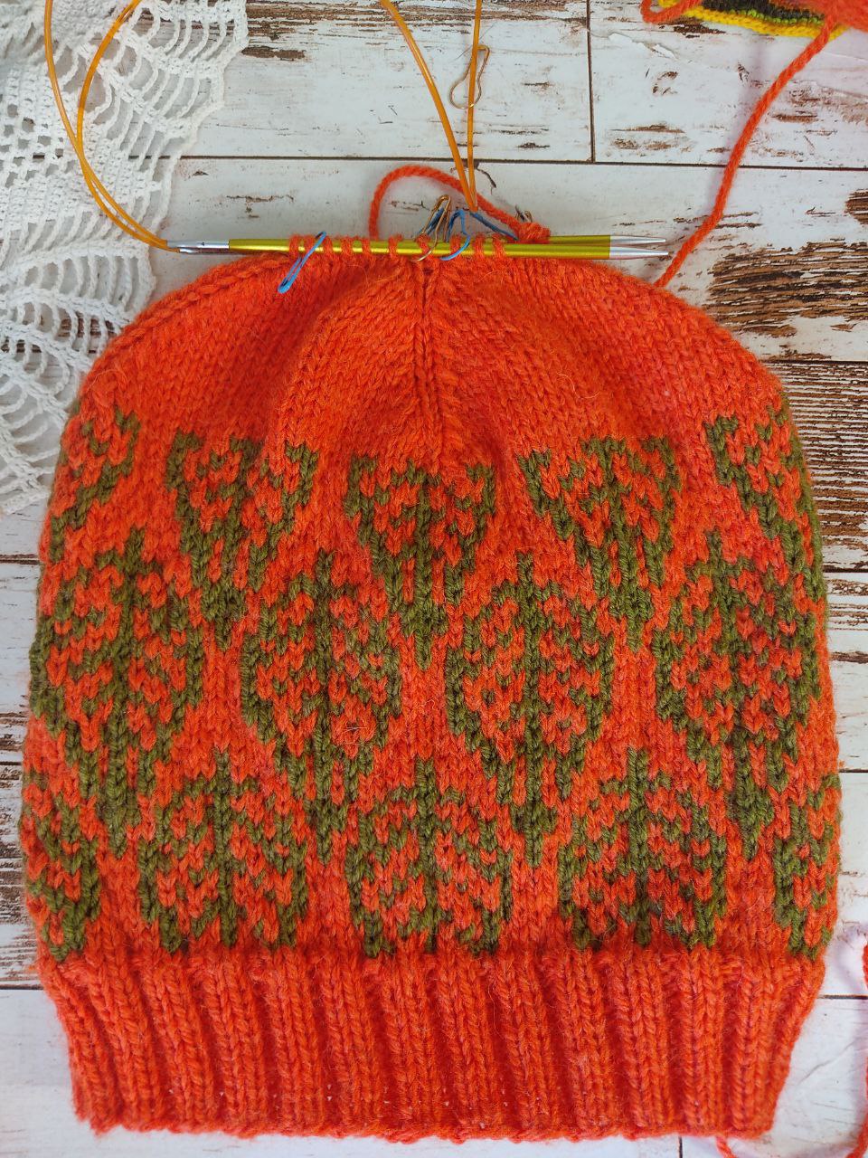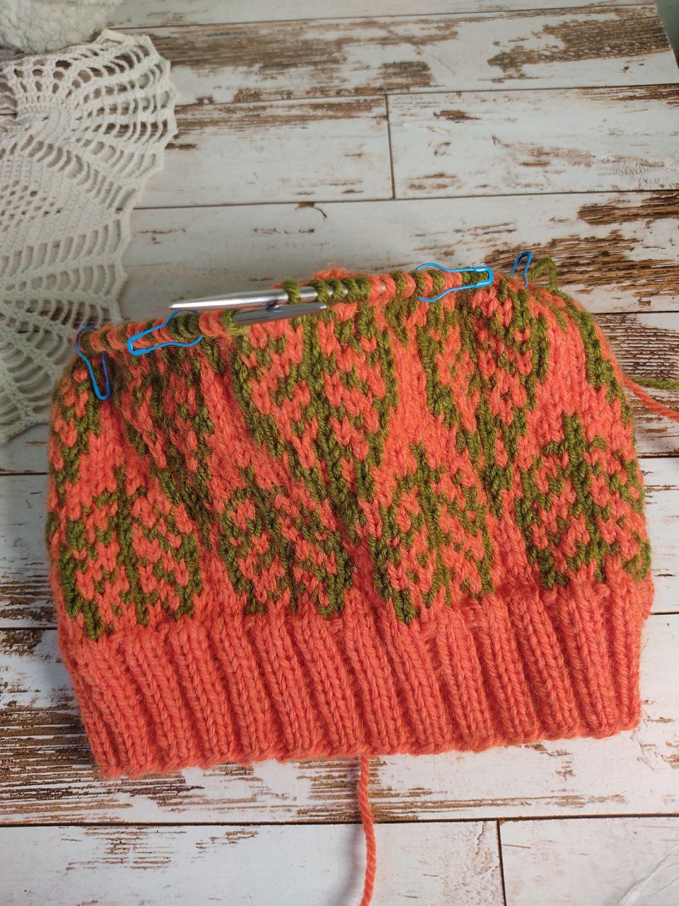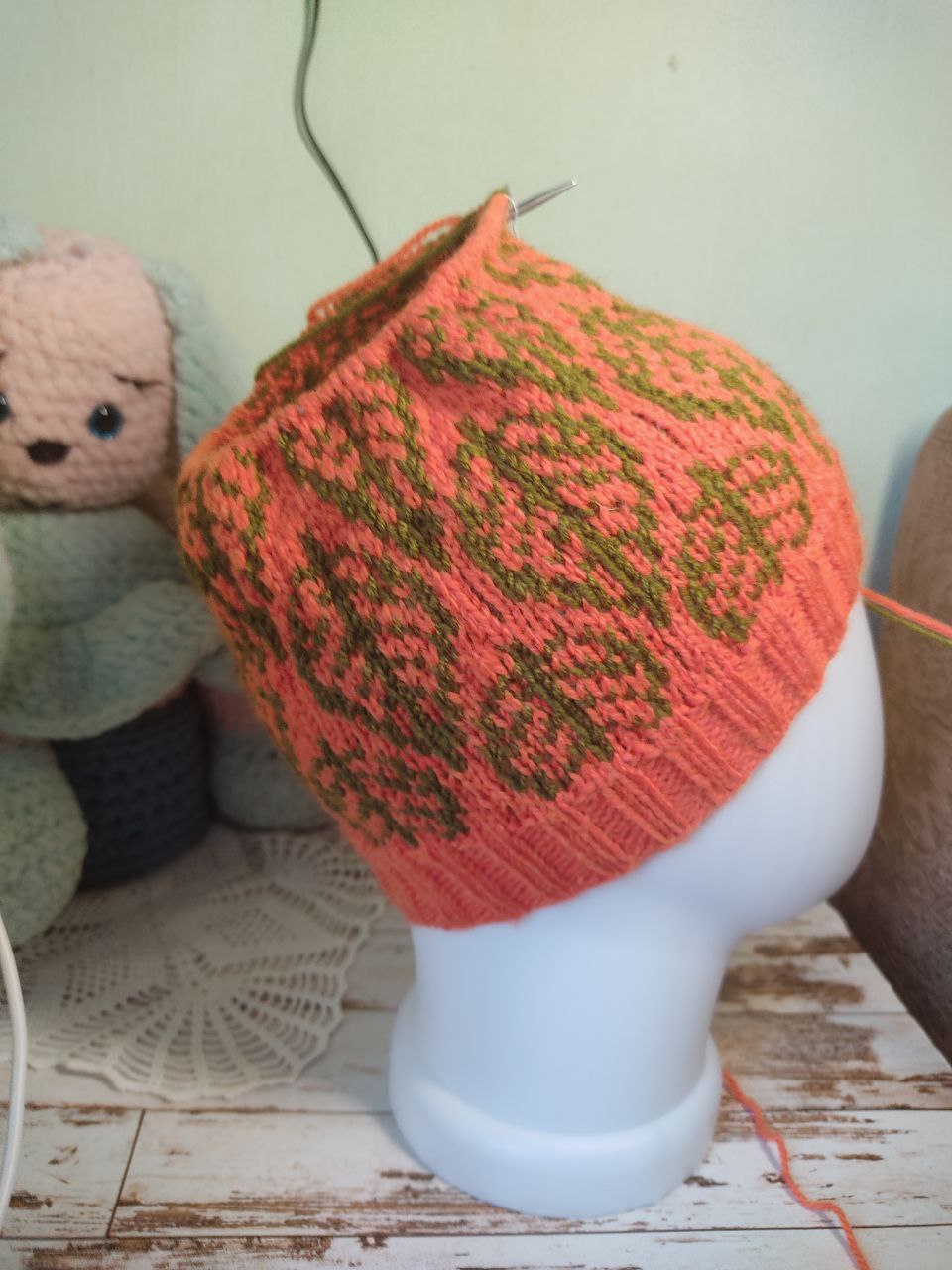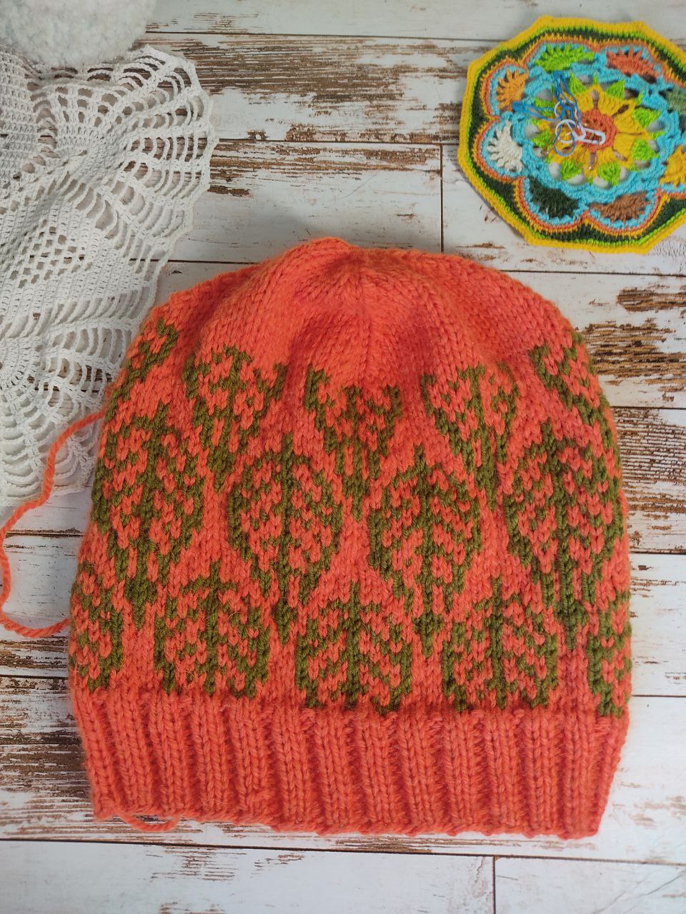 Но я была бы не я, если бы не «переобулась» в тот же момент, как поняла, что с салфеткой мне не светит. И так появилась вот такая шапочка. Давно хотела связать себе что-нибудь жаккардом. Шапка оказалась самой актуальной идеей.