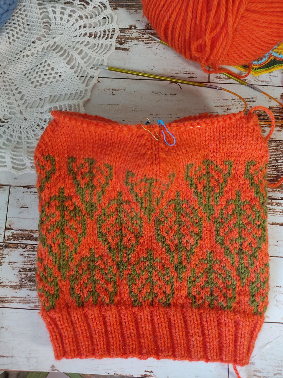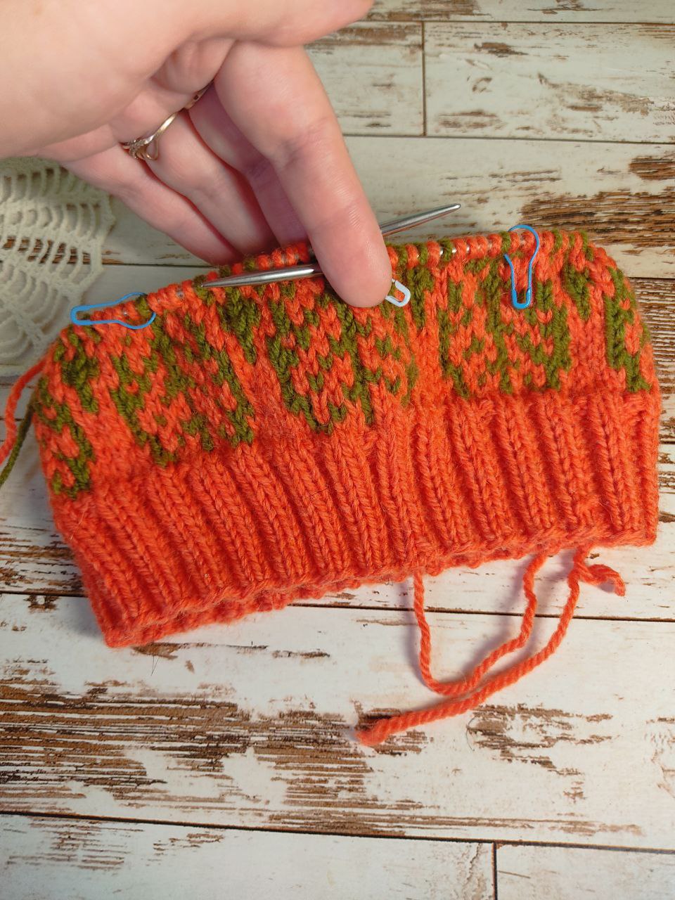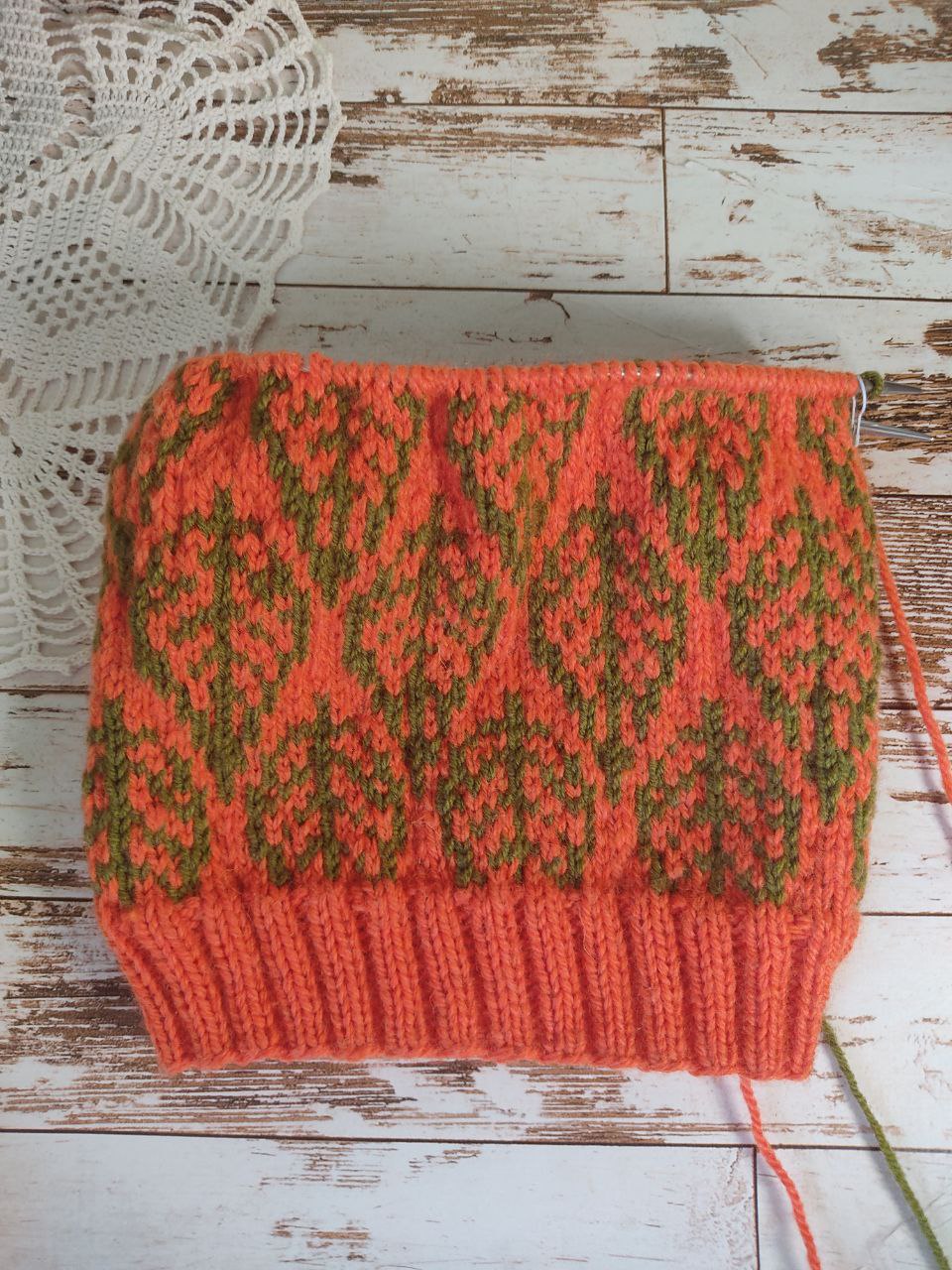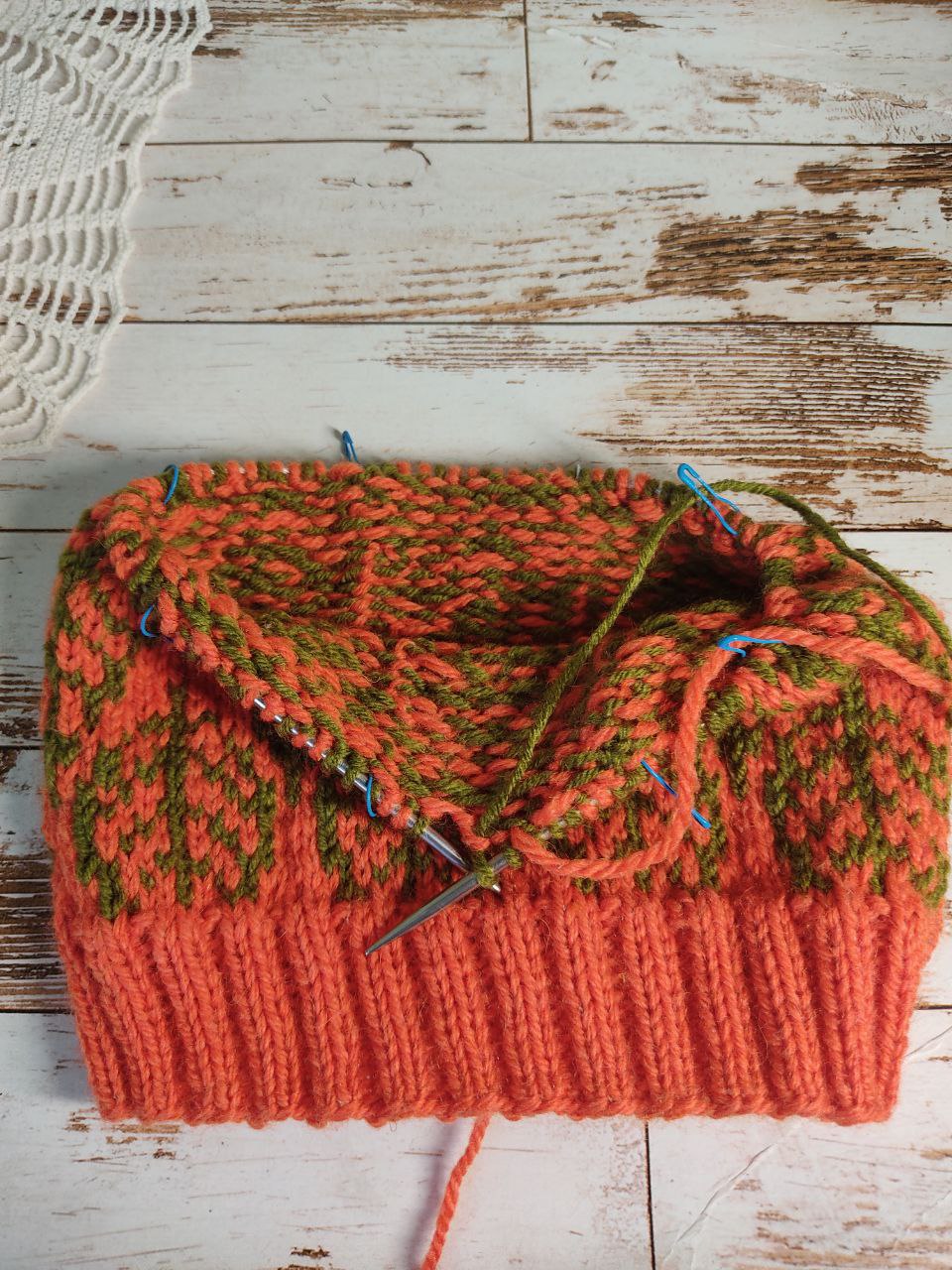 Но я была бы не я, если бы не «переобулась» в тот же момент, как поняла, что с салфеткой мне не светит. И так появилась вот такая шапочка. Давно хотела связать себе что-нибудь жаккардом. Шапка оказалась самой актуальной идеей.