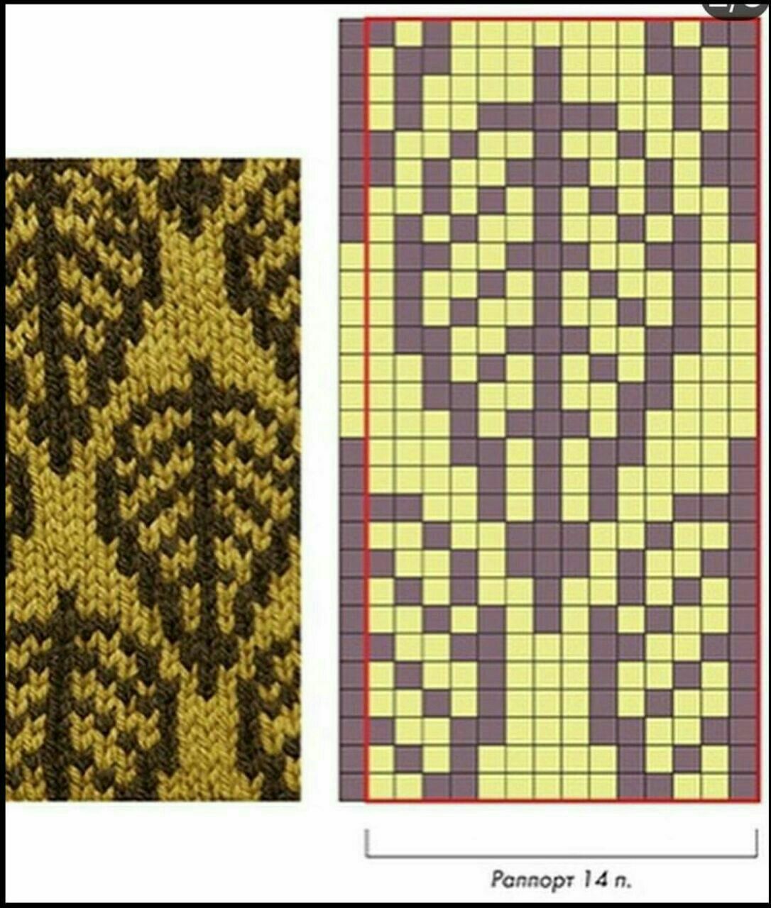 Рапорт составляет 14 петель и 28 рядов. Для удобства я перерисовала узор на тетрадный лист в клеточку и по мере провязывания рядов закрашивала карандашом, чтобы не сбиться.