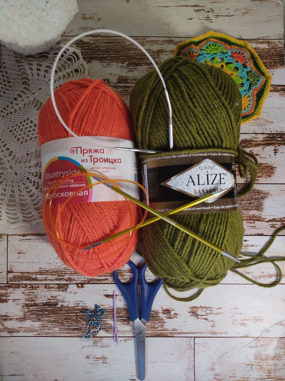 В качестве основного цвета пряжа из Троицка «Классическая» серия «Подмосковная» (Countryside), 50% шерсти, 50% акрил высокообъёмный; 250м/100г; цвет: 250-Рябина
