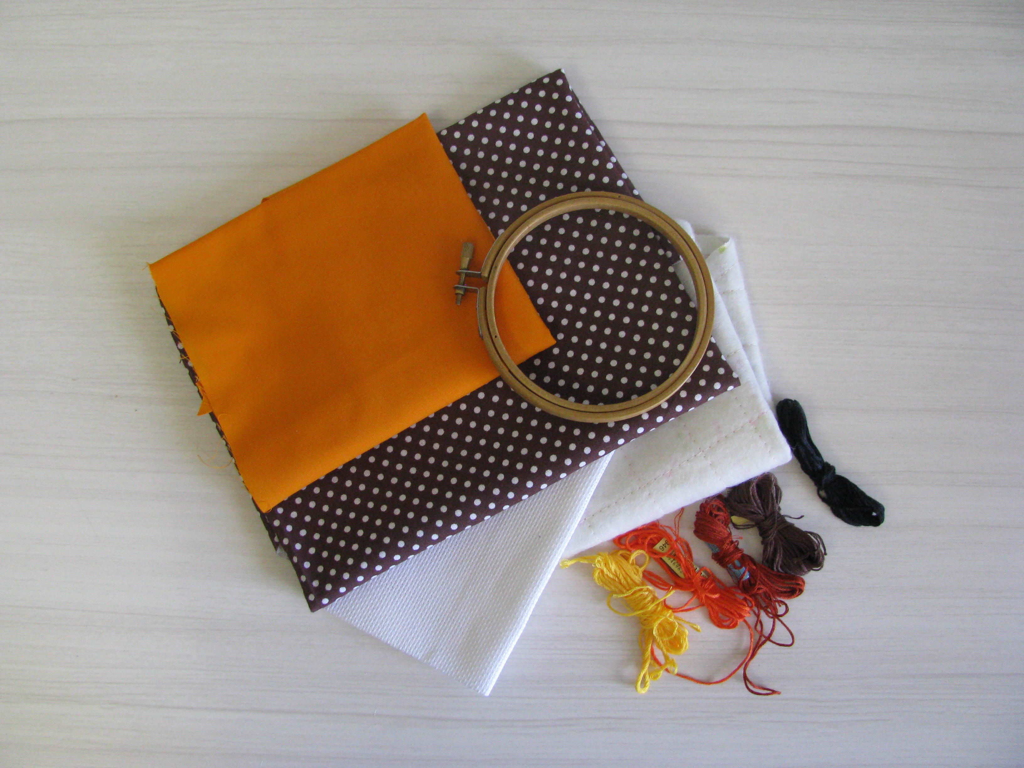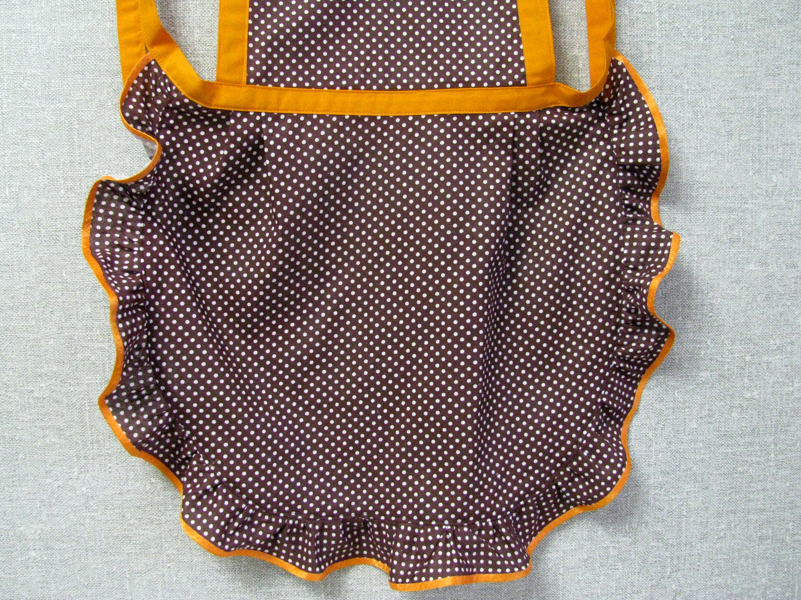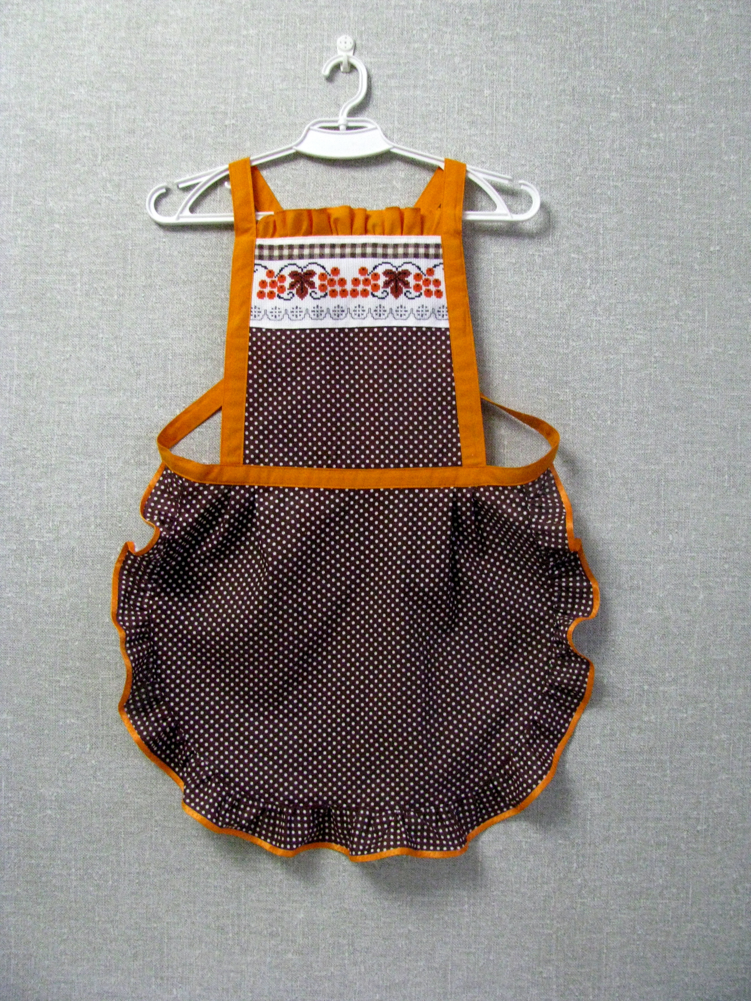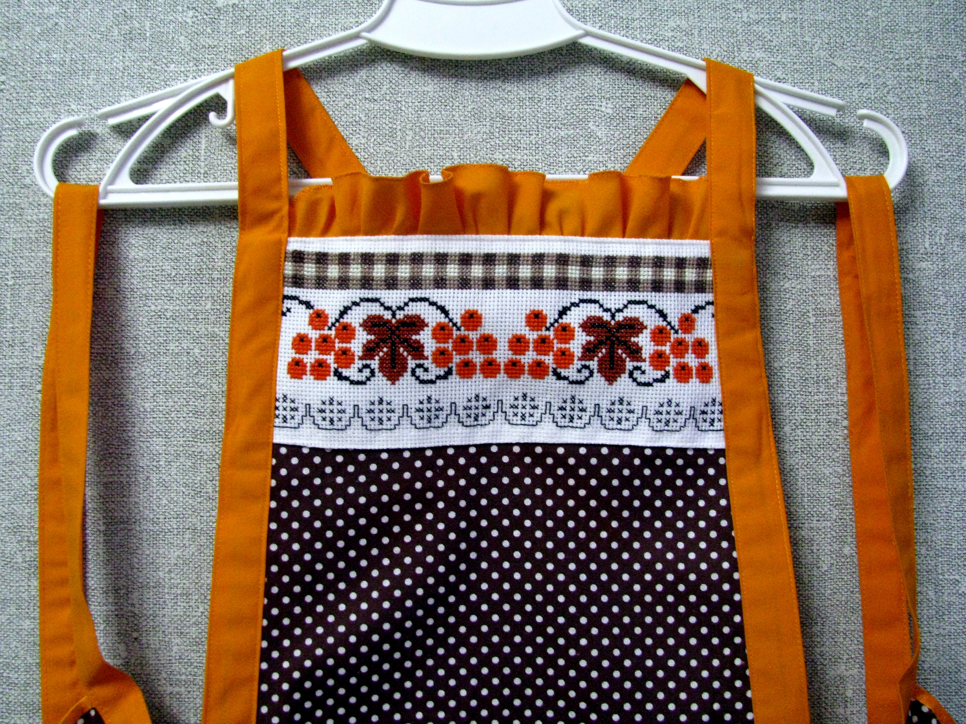Сшит из коричневой бязи в горошек и отделочной ткани оранжевого цвета. Украшен ручной вышивкой крестом.