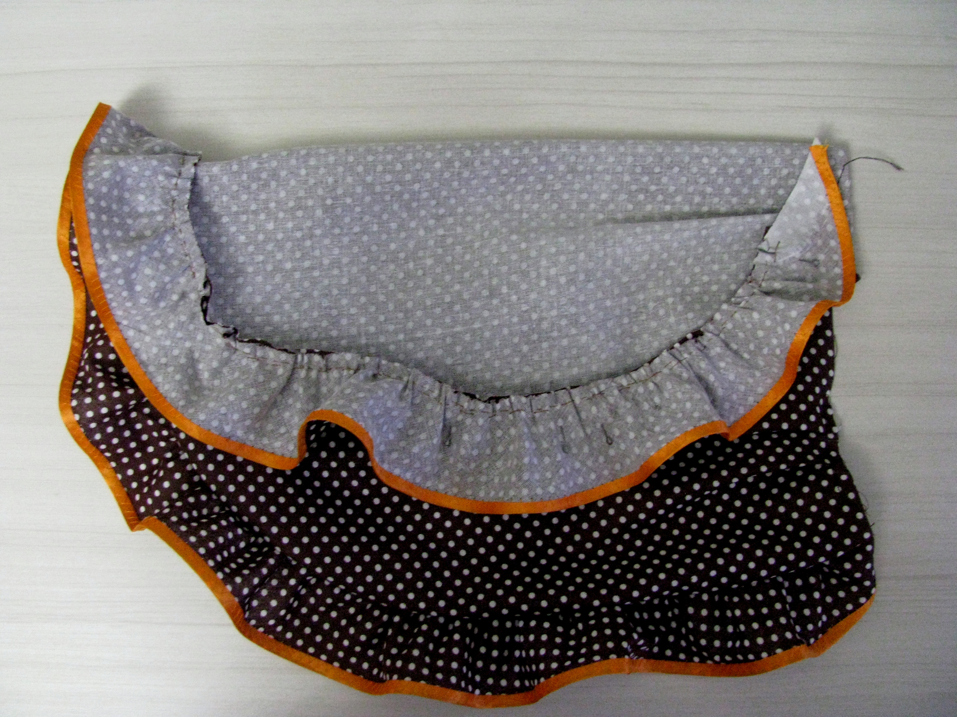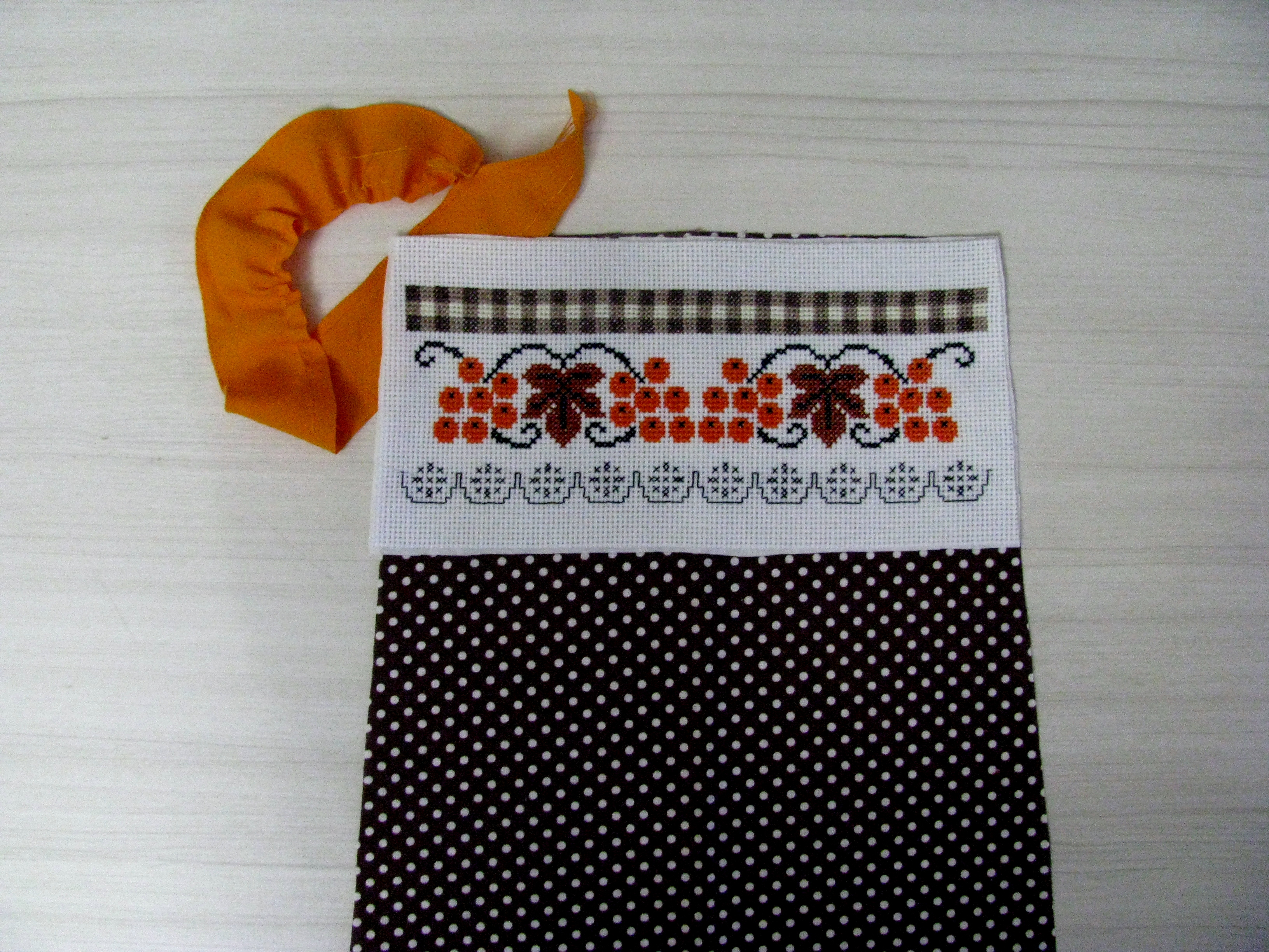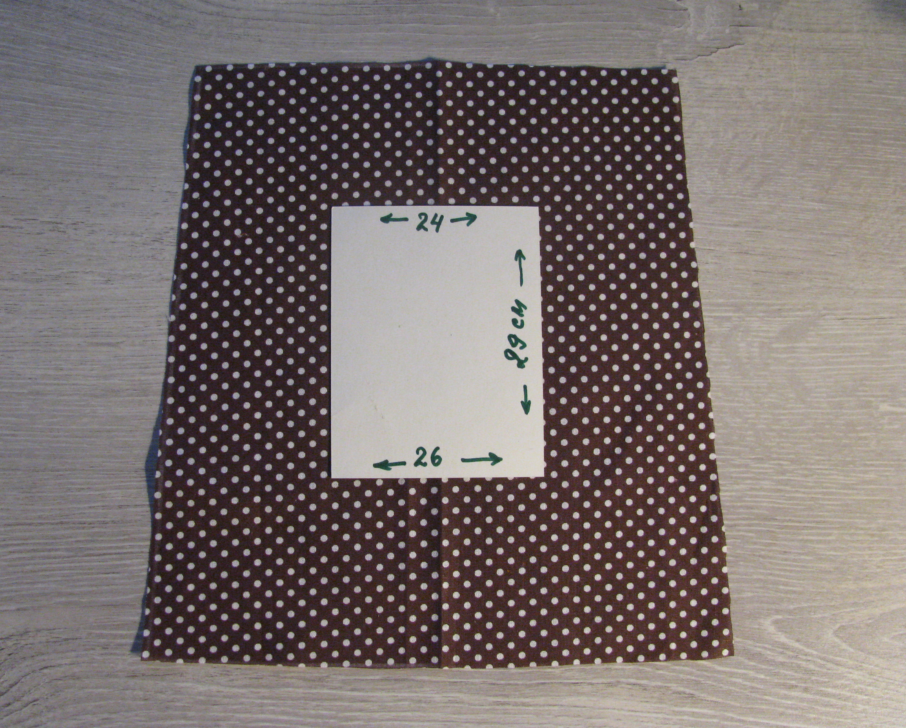Сшит из коричневой бязи в горошек и отделочной ткани оранжевого цвета. Украшен ручной вышивкой крестом.