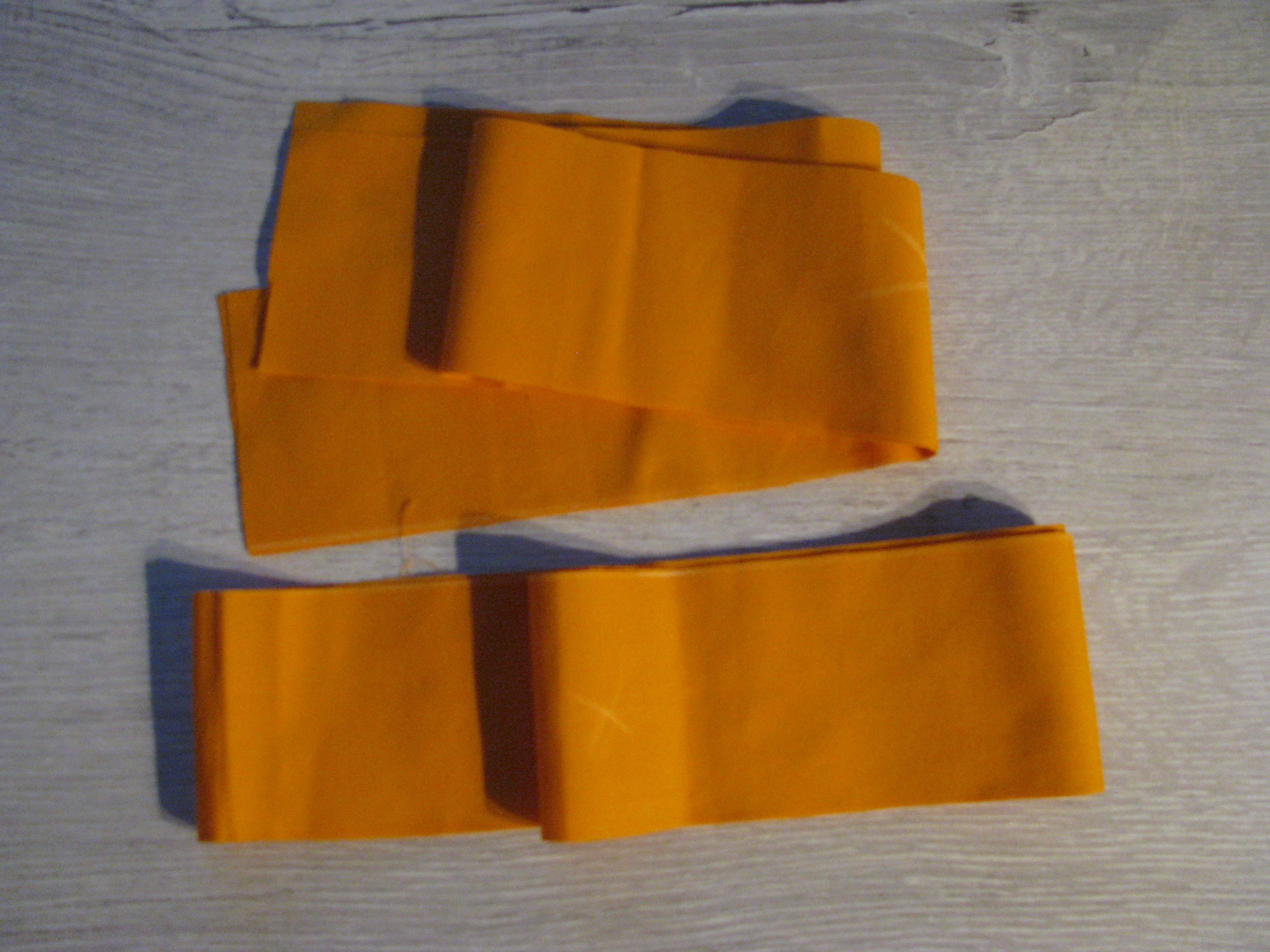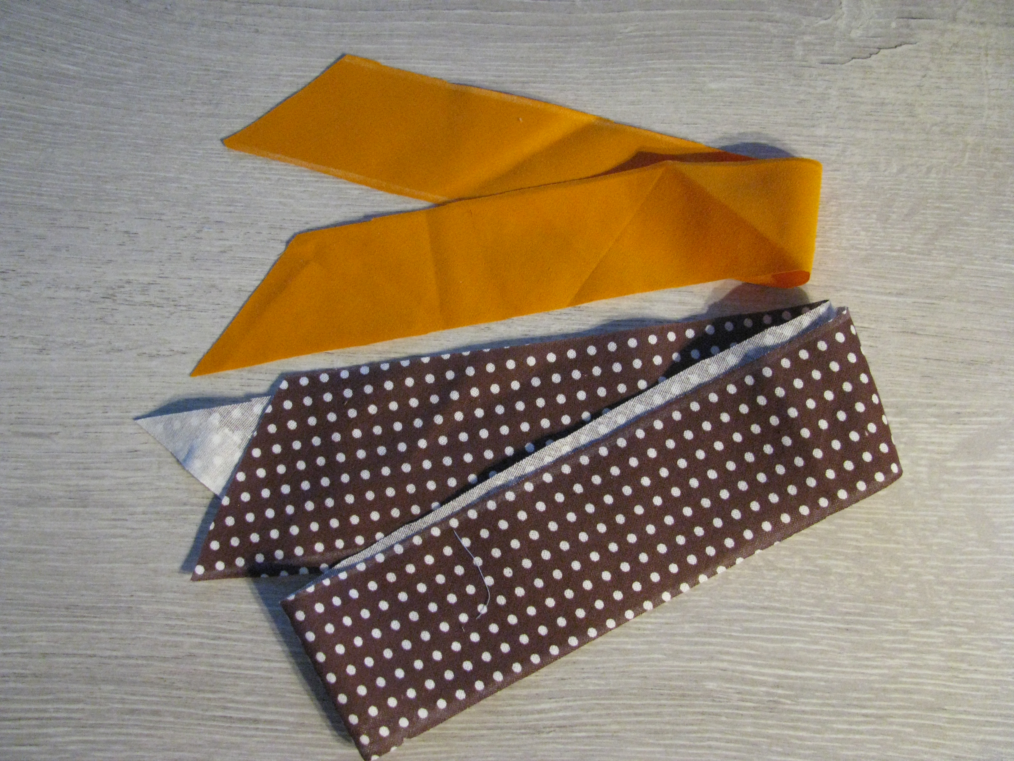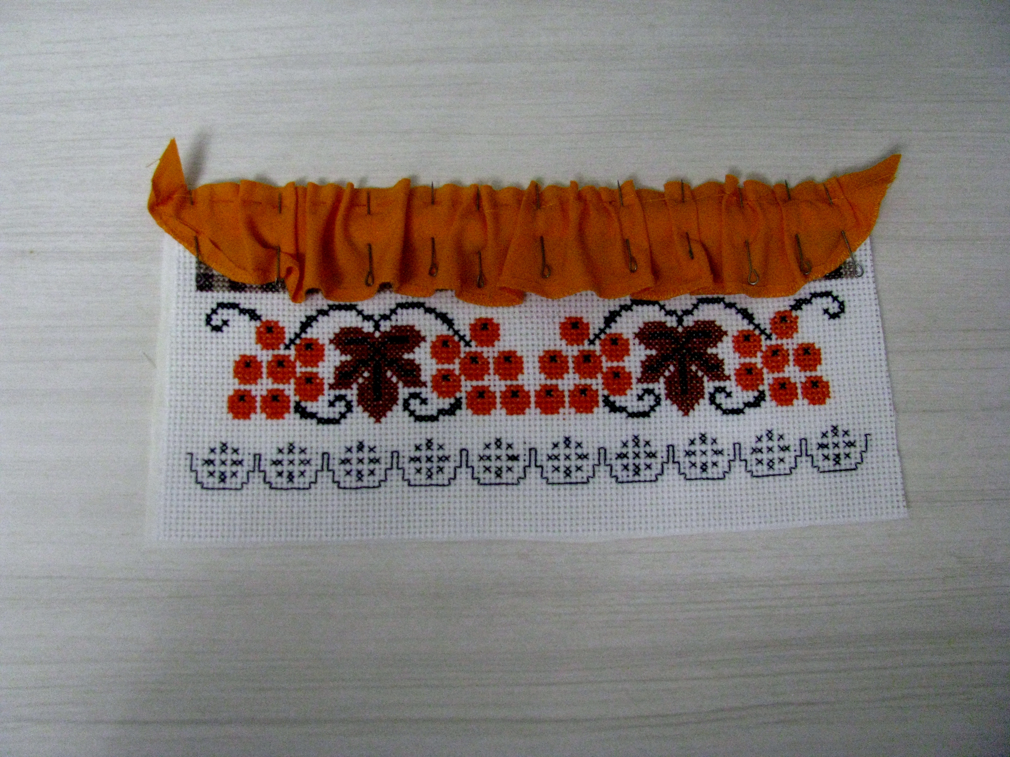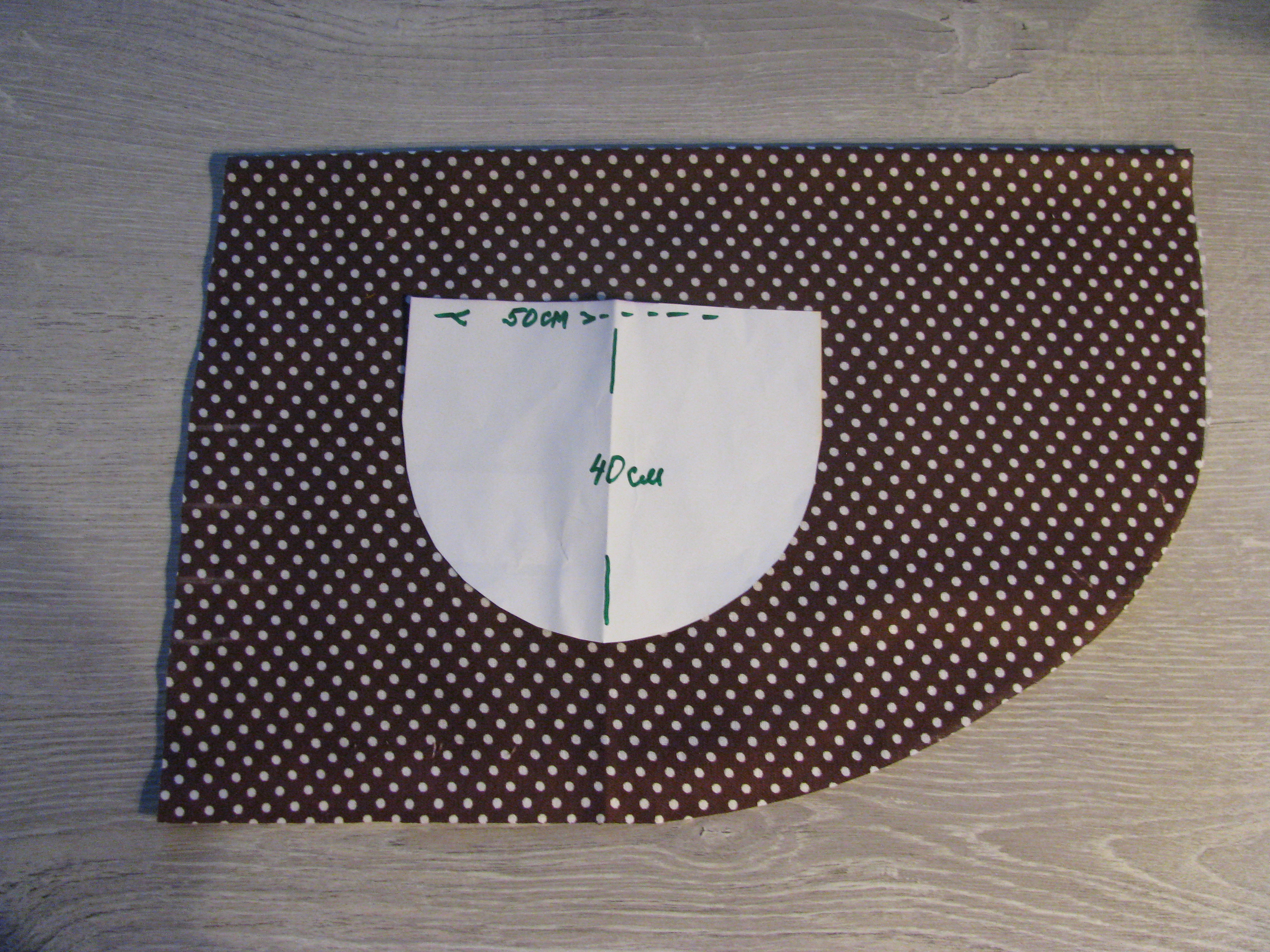 Сшит из коричневой бязи в горошек и отделочной ткани оранжевого цвета. Украшен ручной вышивкой крестом.
