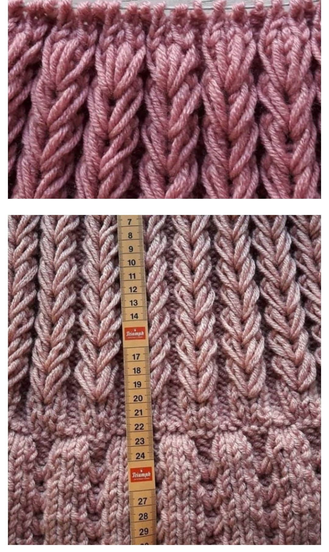 Вместо двух изнаночных в схеме, я провязываю три. Получается так: 72 петли узора + 2 кромочные.Сначала вяжу отворот шапки – это примерно 8-10 см. Потом я меняю рисунок. Как это сделать? В одном ряду просто меняю лицевые петли на изнаночные, а изнаночные на лицевые. И продолжаю вязать основной узор, пока не дойду до убавок.Убавки я начинаю делать, когда шапка достигает высоты 28-29 см от самого начала. Сначала убавляю три изнаночные петли до двух.