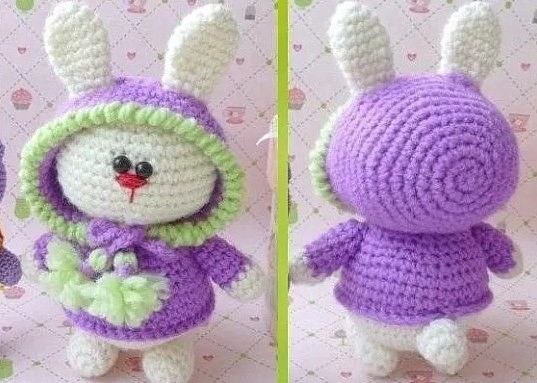 И в конце крепим глазки и вышиваем на мордочке лаконичный крестик в качестве носа и рта. Глазки кролика — безопасные, нос вышит нитками «Ирис». При «сборке» зайчика стоит обратить внимание на то, что сначала пришивается колпак к основанию головы (там где у зайчика должна быть шея). Перед тем как пришить колпак, не забудьте выровнять отверстия под уши (они должны быть расположены симметрично по центру головы). После того как капюшон пришит к голове, крепко пришейте туловище.