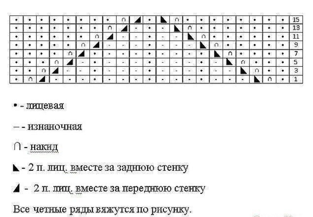 1-й ряд: провяжите 1 лиц. п., накид, провяжите 2 лиц. п. вместе за заднюю стенку, 3 изн. п., 1 лиц. п., 3 изн. п., 1 лиц. п., 3 изн. п., 1 лиц. п., 3 изн. п., провяжите 2 лиц. п. вместе за переднюю стенку, накид, 1 лиц, повторите *-*.