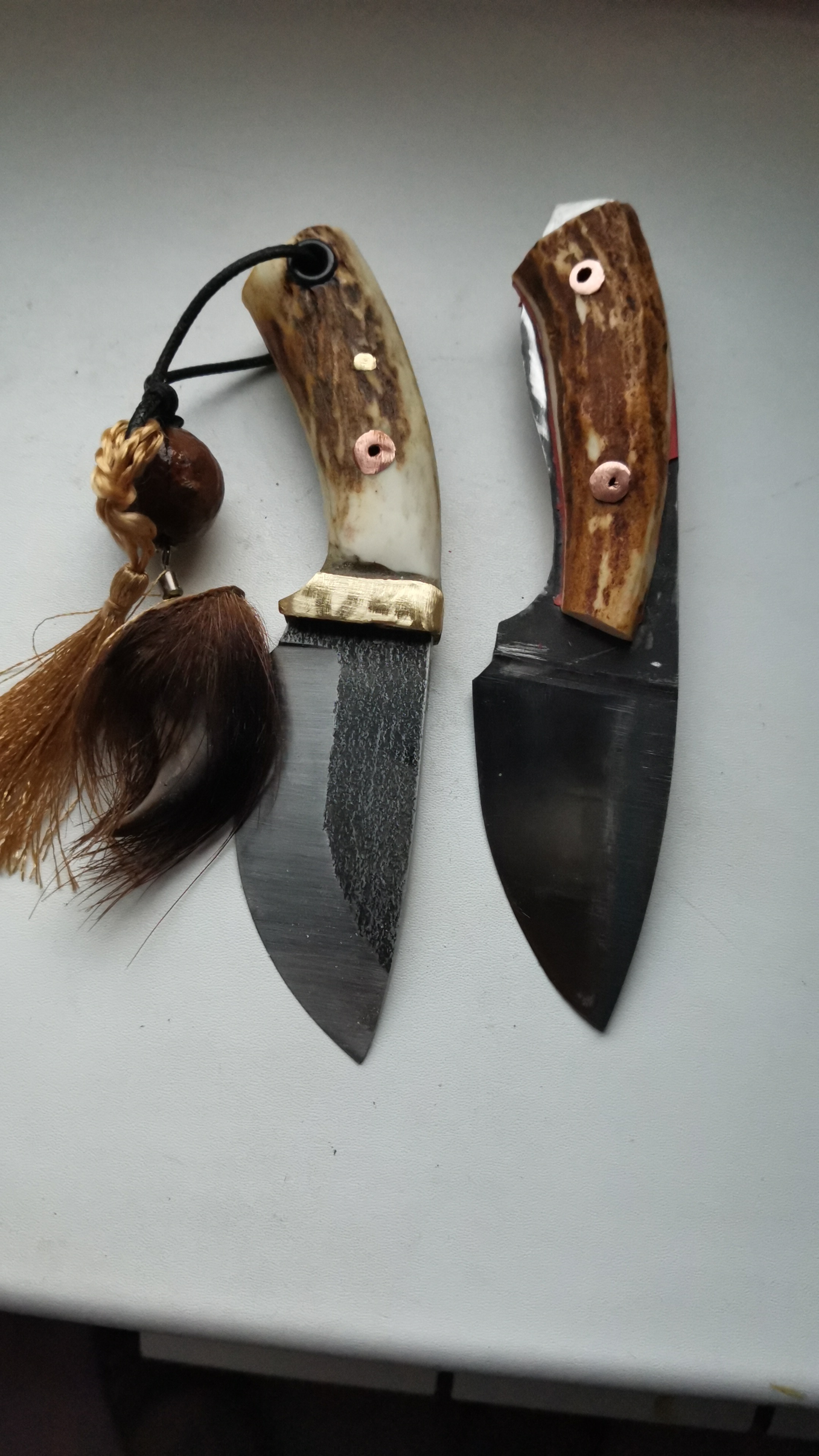 Рукоять-рог лося, подвеска орех макадамия, со встроенной внутрь бусиной Агата, и медвежий коготь, нож обладает всеми функциями обычного ножа, удобен в руке. Можно использовать в виде брелка, кулона, подвески...