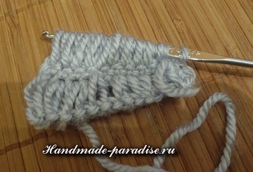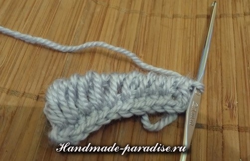 Провязав второй ряд вязание поворачиваем (не переворачиваем, а вяжем по кругу). В первый наборный ряд провязываем столбики с накидом, собирая их все на крючке. Длину накидов будем увеличивать, то есть: накиды вытягиваем все по-разному, первый — меньше, второй — чуть больше и так далее.