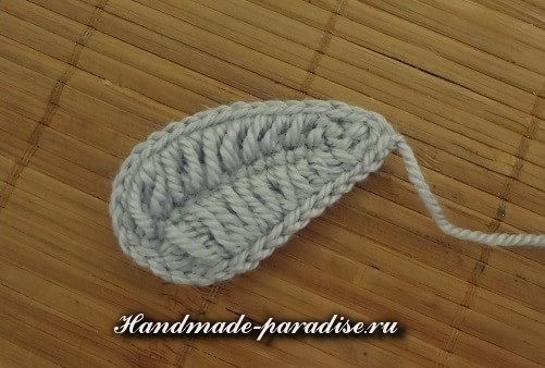 Соединяем 2-й и 3-й ряды соединительным столбиком, вязание не поворачиваем, а будем вязать в обратную сторону. Вяжем глухие петли, то есть обвязываем краешек листика, чтобы спуститься вниз — к основанию листочка. Спустившись вниз, можно закончить вязание листика, а можно продолжить — обвязать глухими петлями и вторую сторону листика (это как вам больше понравится).