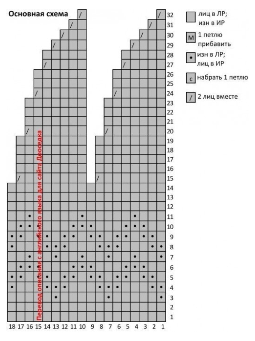Выполняем 1-32 ряды схемы 3, при уменьшении количества пт переходим на чулочные спицы.