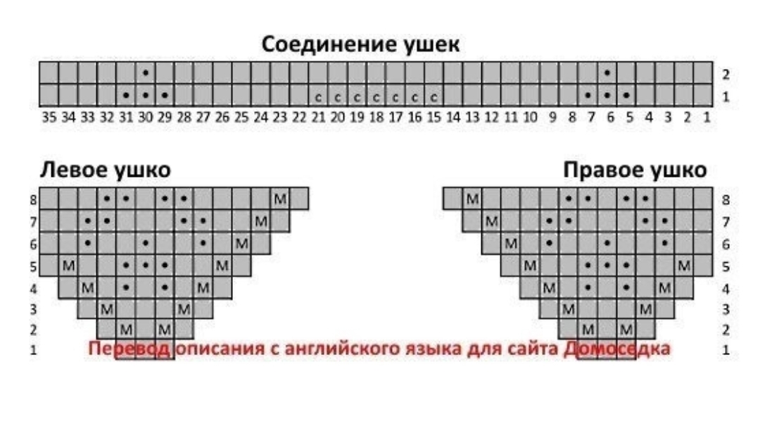 Вяжем ряды 1-8 по схеме 2, нить отрезать не надо – будем ушки объединять.