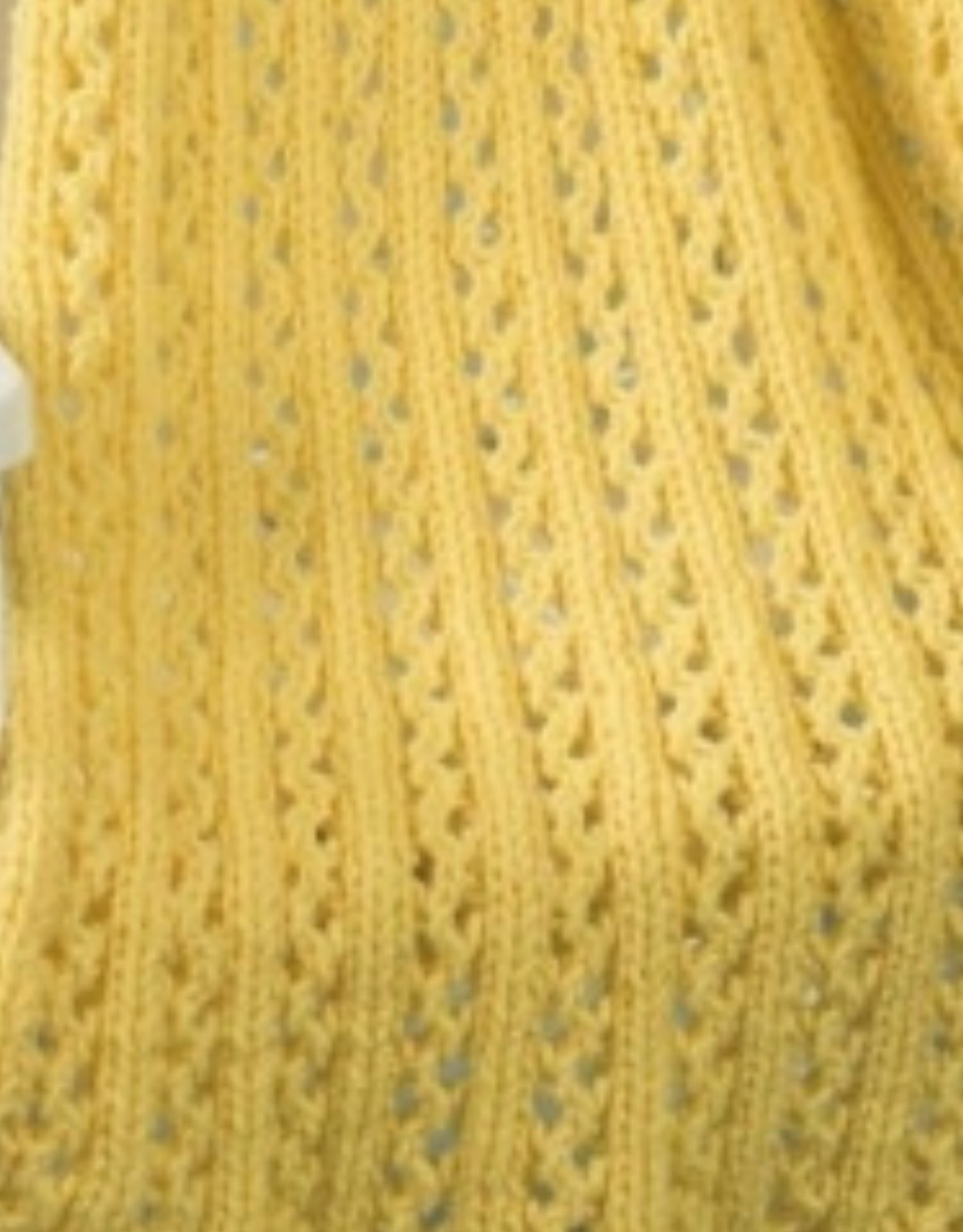 Простой ажурный плед, связанный из довольно толстой пряжи на спицах. Вязание пледа осуществляется узором веточки, раппорт которого составляет 4 ряда.