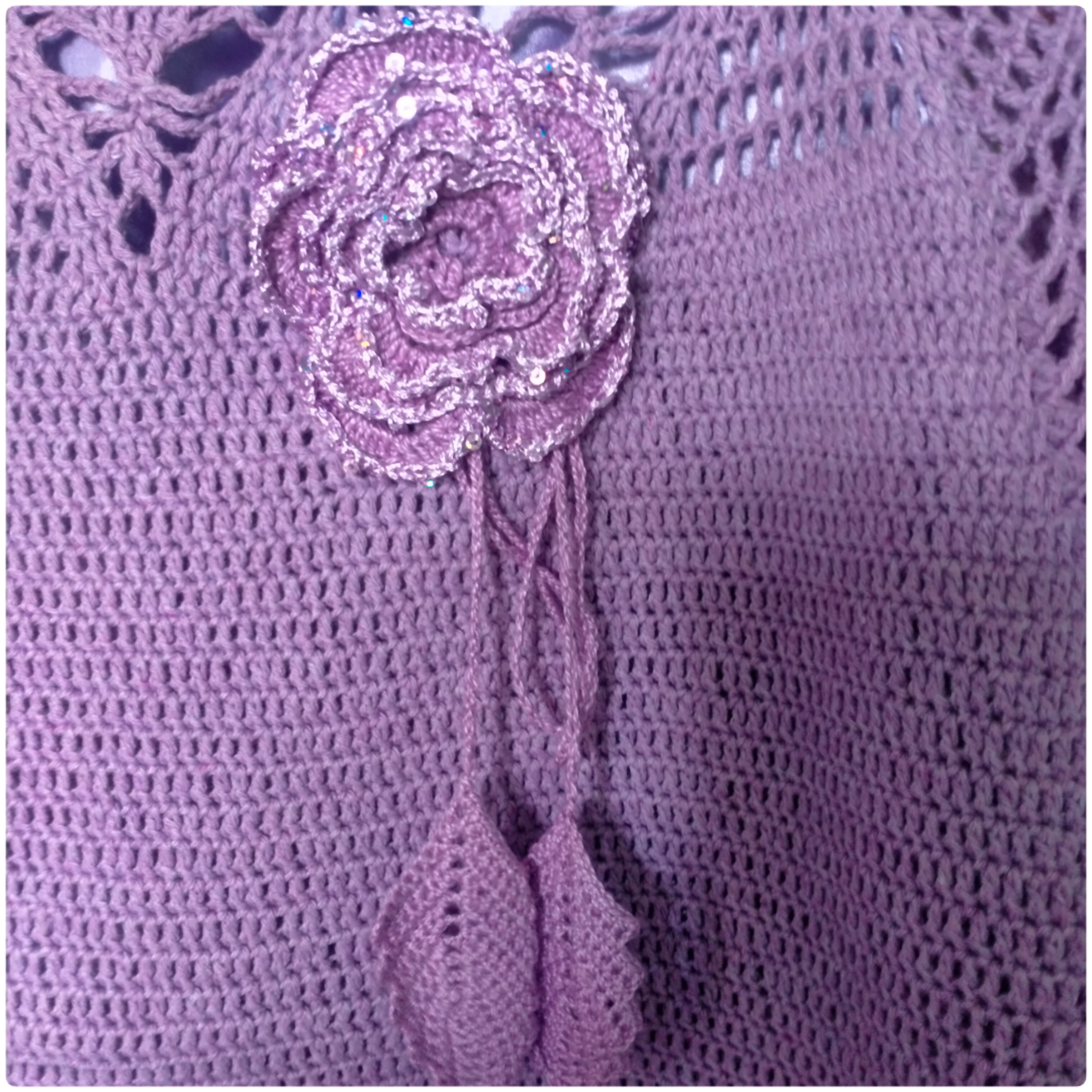 Вяжем шелковой пряжей сиреневого цвета с добавлением пряжи с пайетками по схеме ирландский цветок. И два листика по