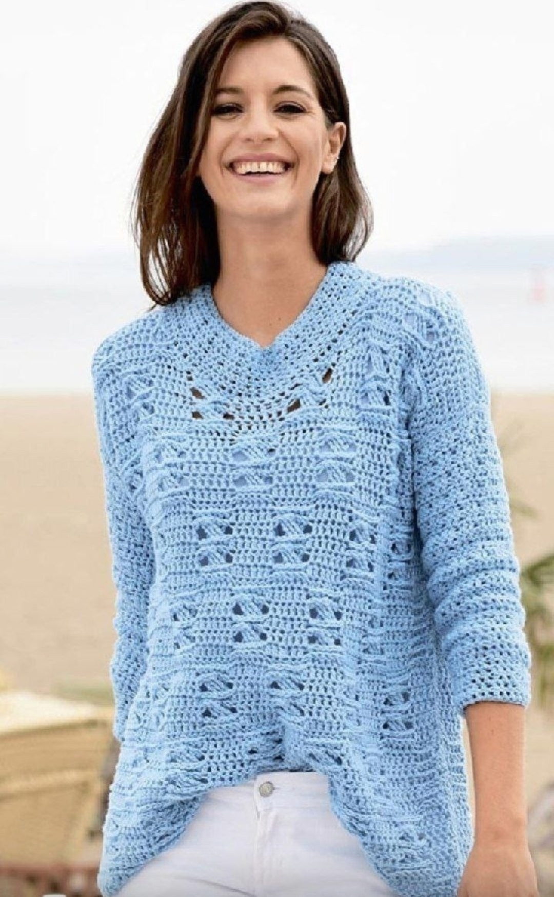 Пряжа (75% шерсти, 25% полиамида; 125 м/50 г) – 400 (450) г голубой; крючки № 4,5 и 5,5.