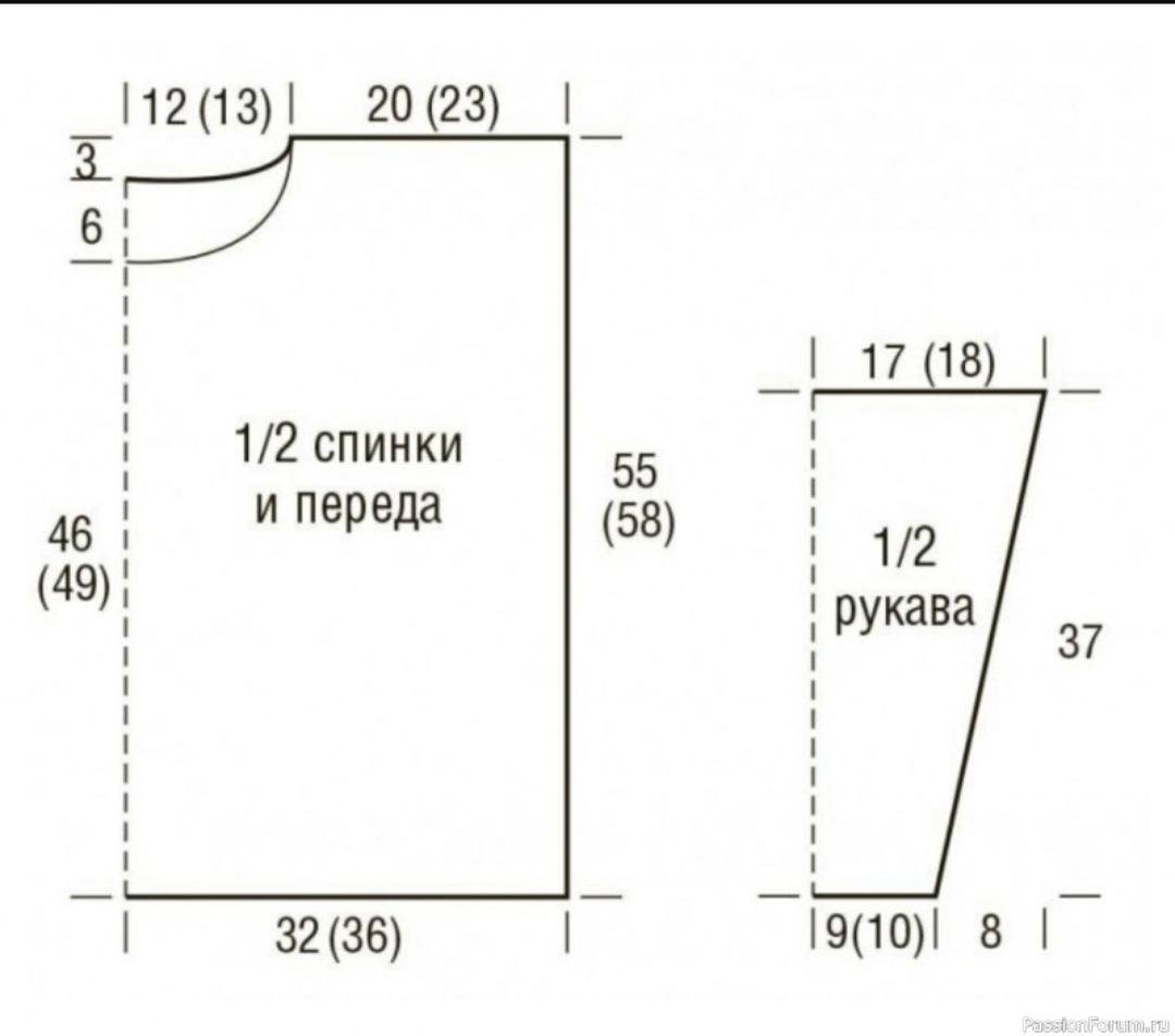 Вязать, как спинку, но с более глубокой горловиной. Для этого через 46 (49) cм от начальной цепочки оставить непровязанными средние 17 (19) п. и далее обе стороны вязать раздельно.
