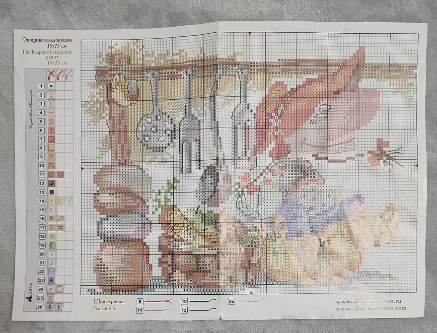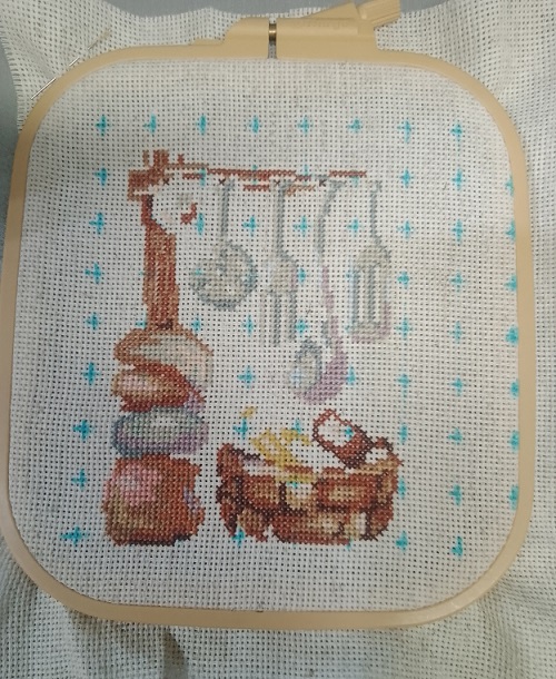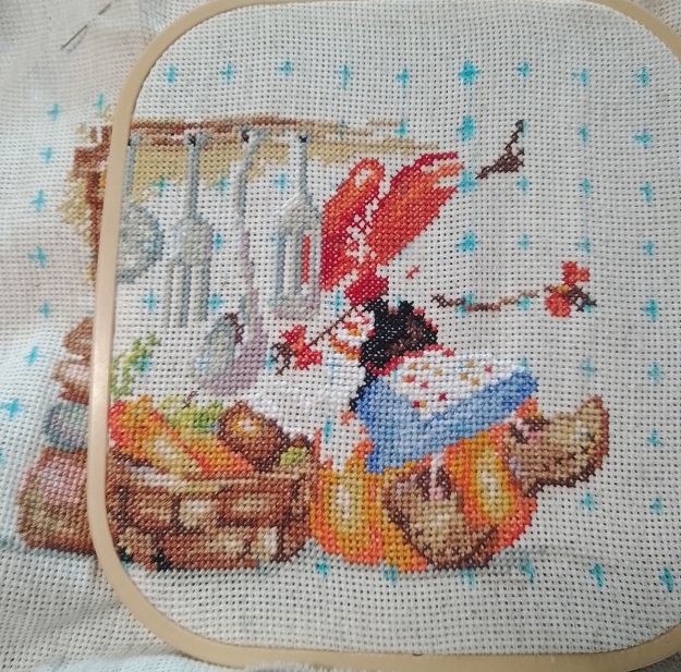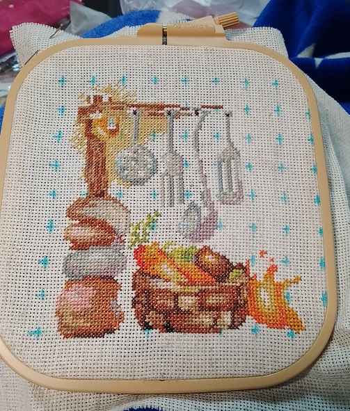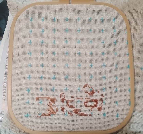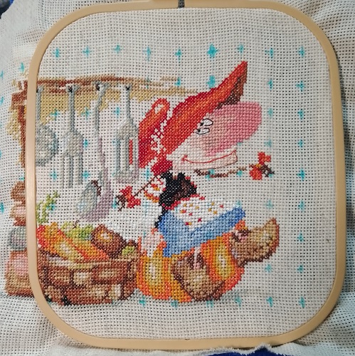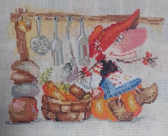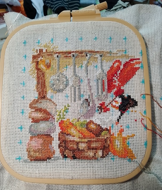 Канва вставлена в пяльцы, разметка на канве нанесена, настроение отличное и благословясь начинаем вышивать.В работе использован крест в две нити, и полукрест в две и одну нить. Обшивка в одну нить 6 цветов.