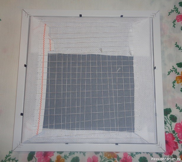 Рамочку подобрала из своих запасов. На этом фото показан принцип натяжки канвы на картон, для того, чтобы вставить в рамку (прошу прощения, что это фото от оформления другой вышивки, я просто забыла снять этот процесс, когда оформляла свою домовушку).