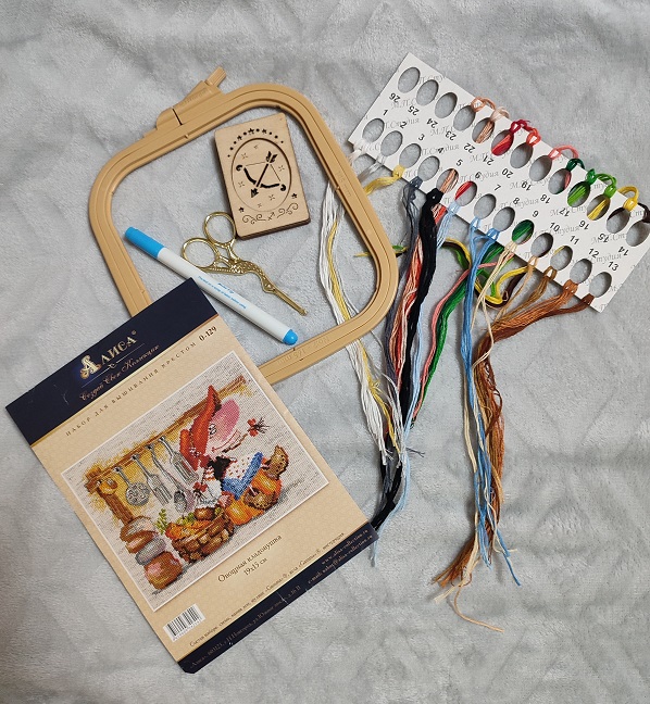 Для работы нам понадобится: нитки мулине, игла для вышивки, канва, маркер для разметки канвы, пяльцы и схема для вышивки.
