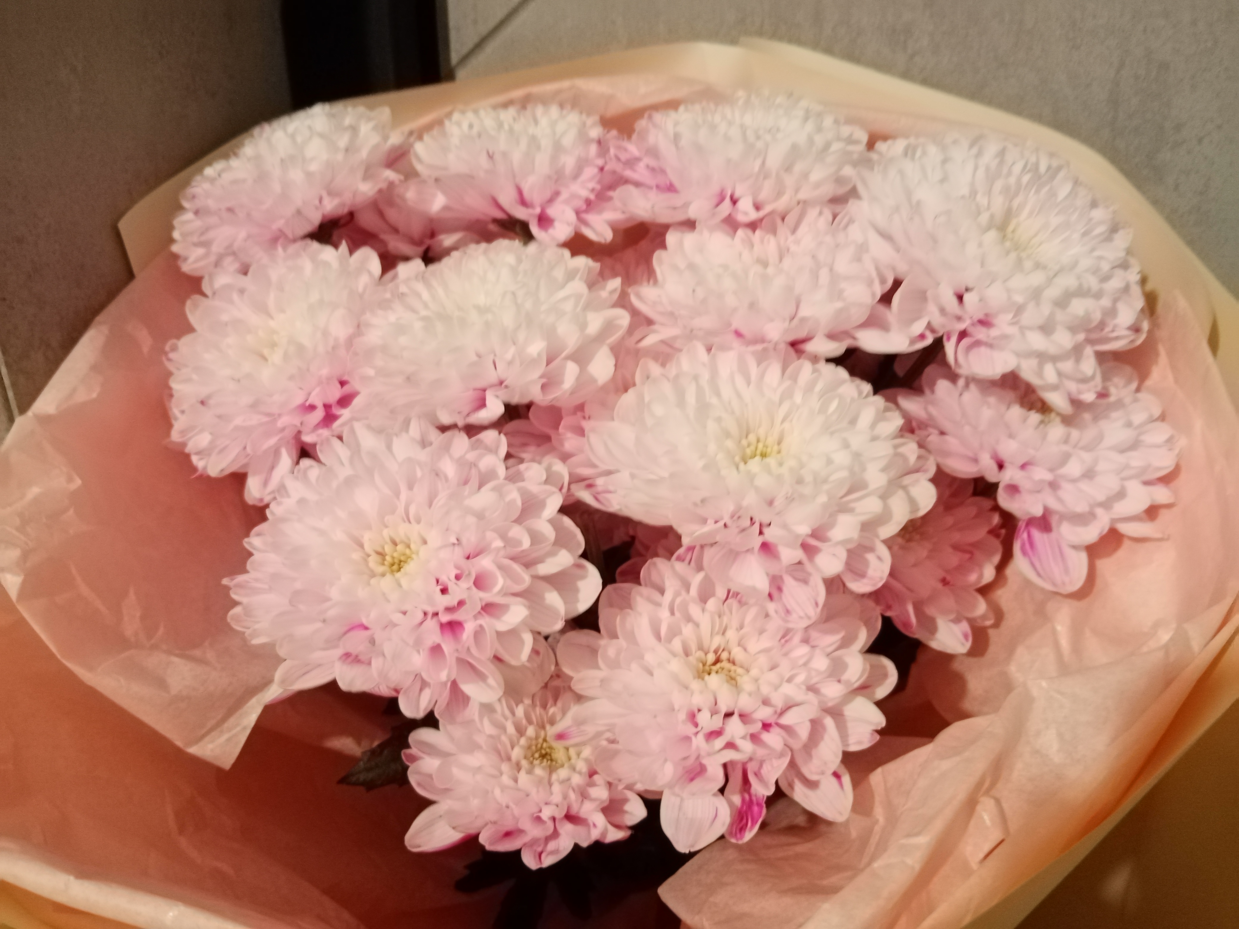 Букет прислали сын и невестка. Доставил курьер. Фото не передает всей нежности и красоты цветов. Но хризантемы очень красивые, поверьте...