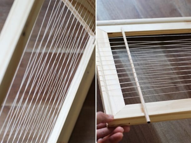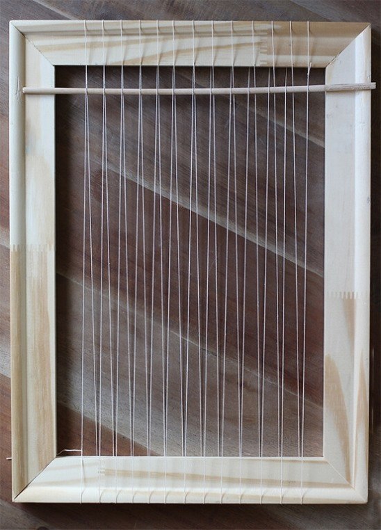 Так должен выглядеть законченный станок. Обратите внимание — теперь нити основы перекрещиваются над деревянной рейкой. Они равномерно разделены на верхний и нижний слои, что существенно облегчит процесс ткачества в дальнейшем.