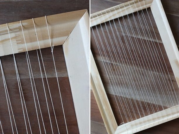 Конец нити привяжите на двойной узел к левому нижнему углу рамы, затем проведите клубок сквозь раму, перебросьте нить через верхнюю перекладину, спуститесь к нижней.